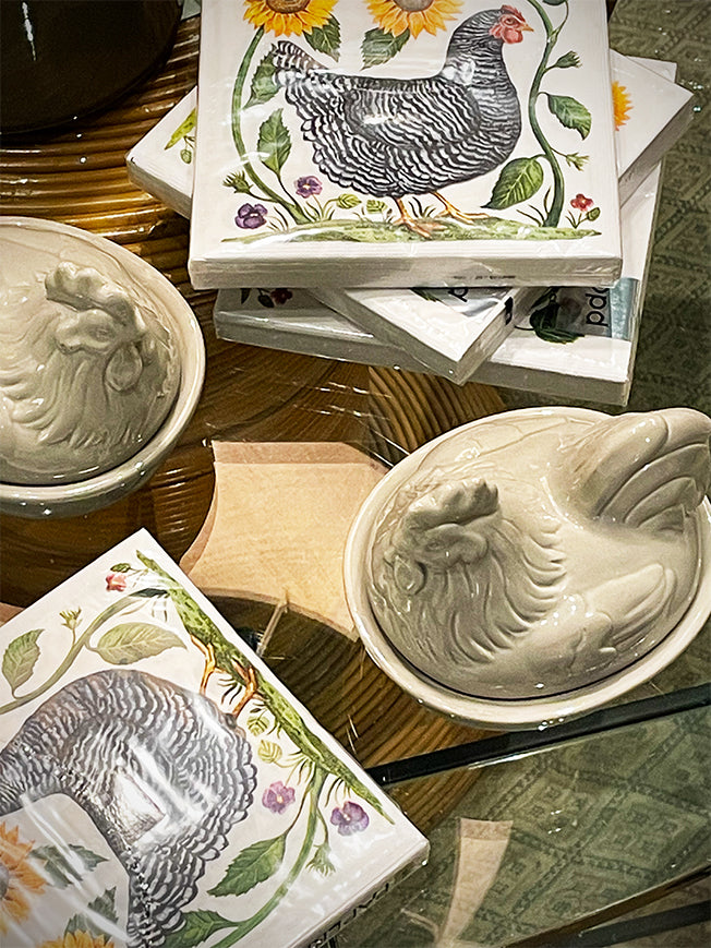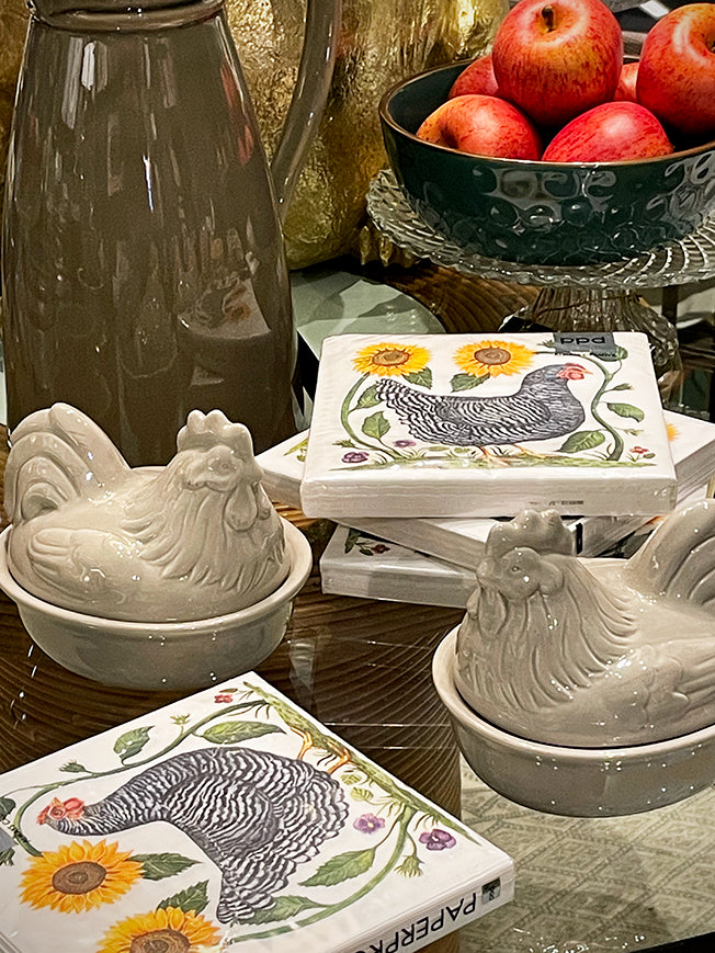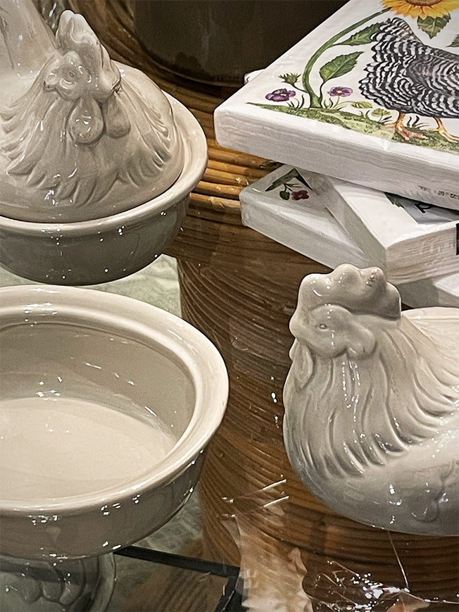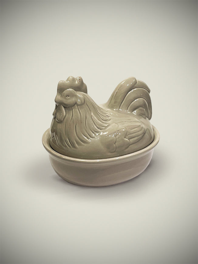 An original butter dish with a taupe-colored hen-shaped lid. A terrine also ideal for serving pâté and other foods.