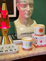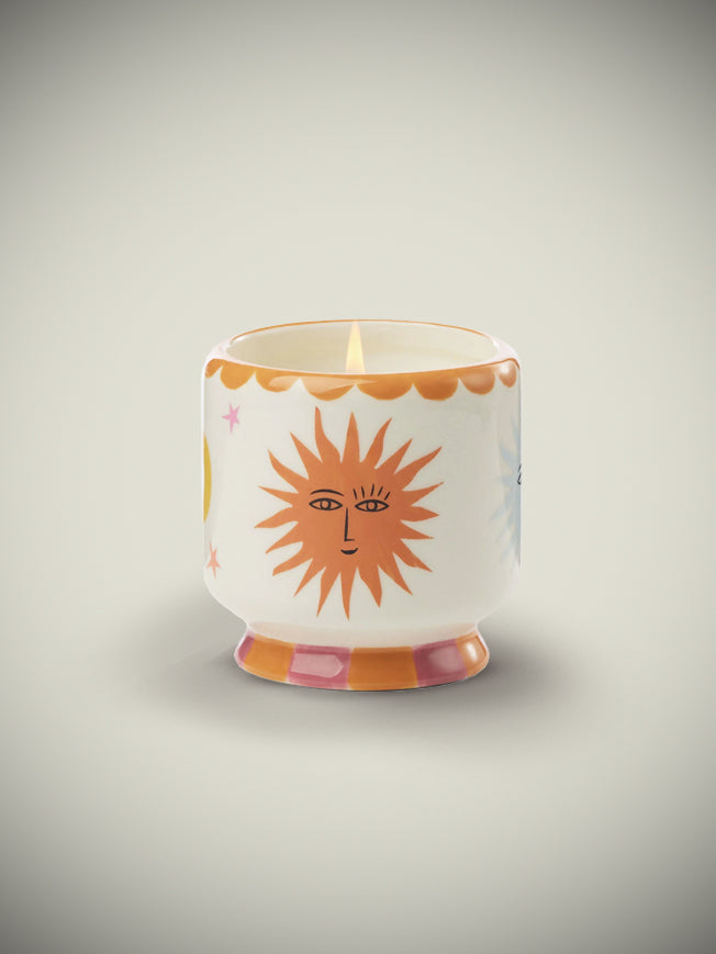 An original and bold scented candle inspired by the Mediterranean and beyond, featuring a ceramic jar with hand-painted details. With a wonderful illustrated design with suns and moons and a delicious orange aroma.