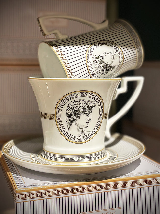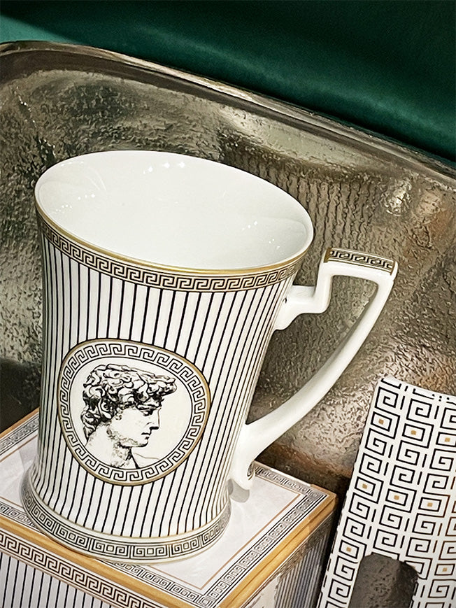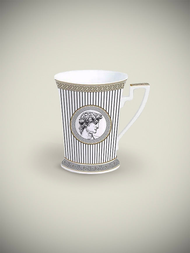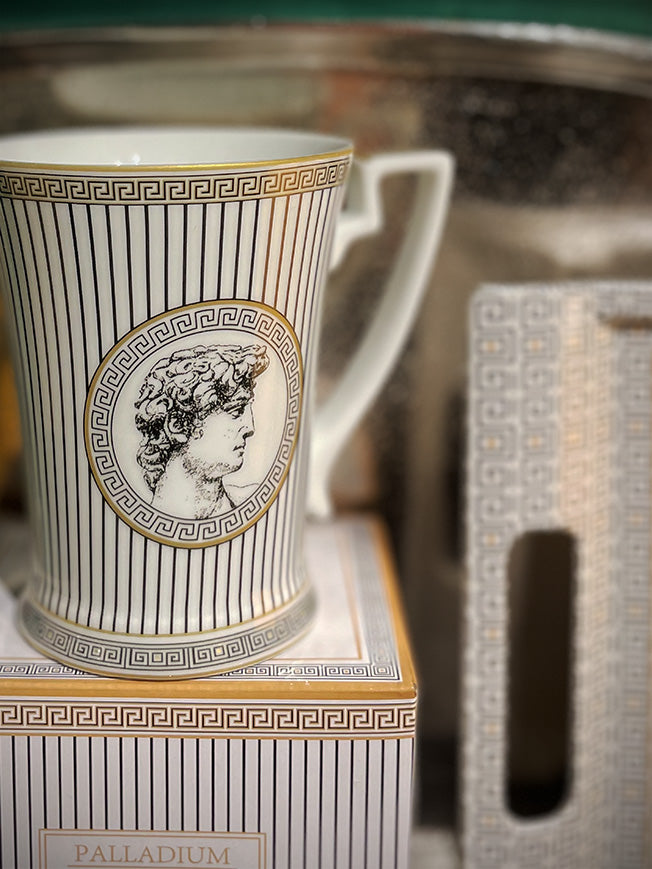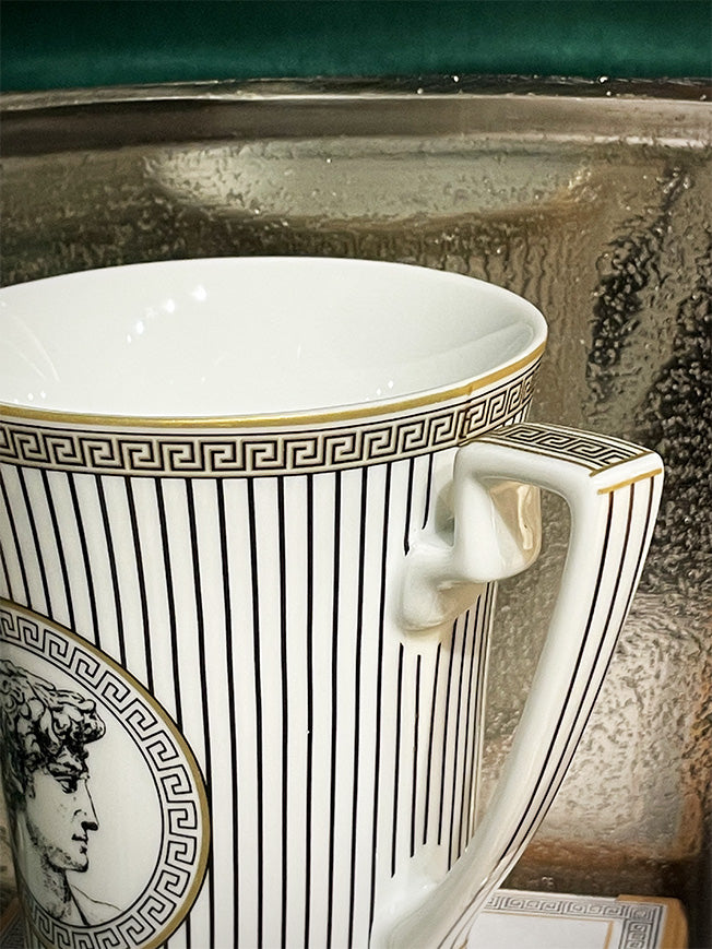 A magnificent porcelain mug, in a classic and elegant design in black and white Greco-Roman style and gold finishes.