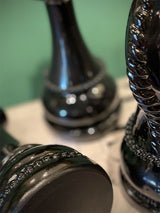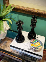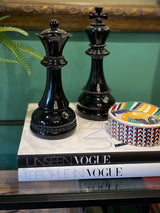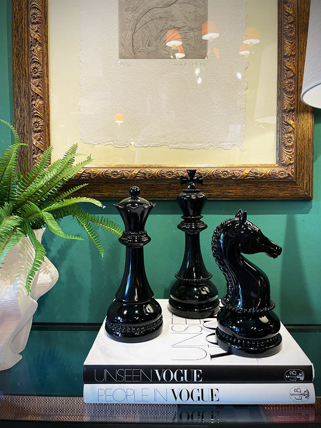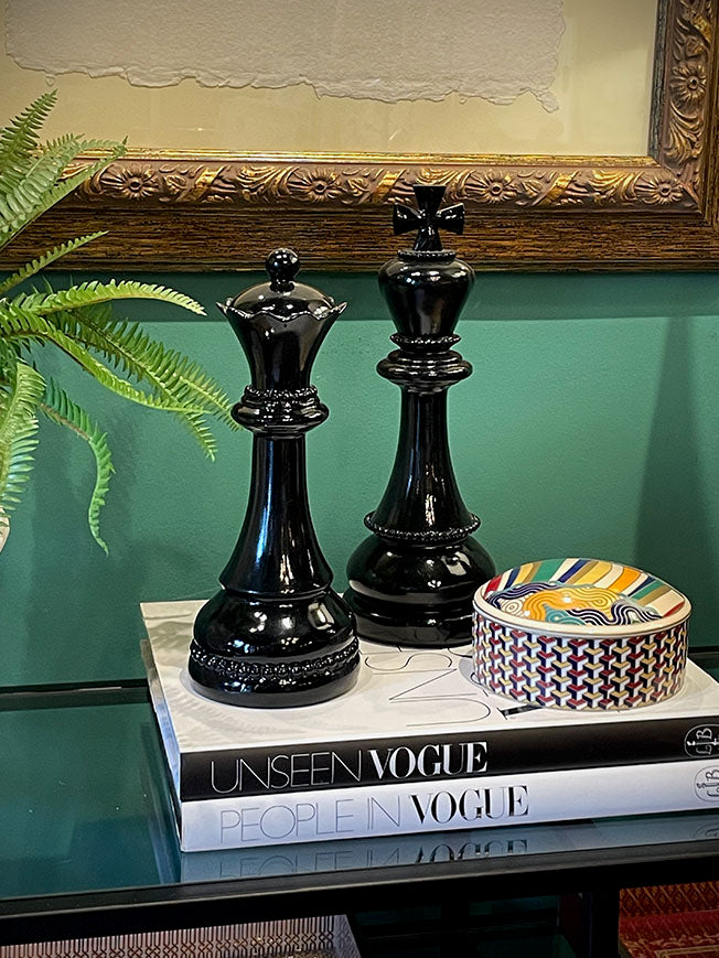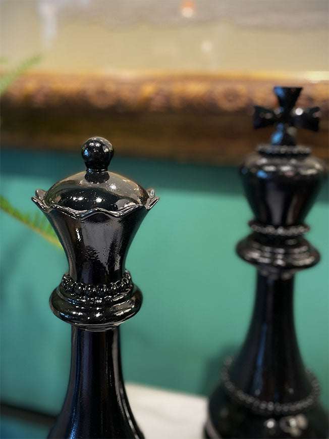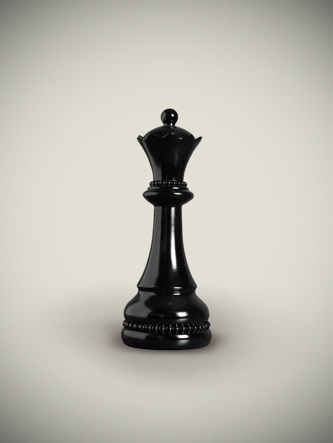 A sophisticated decorative queen-shaped chess piece, elegantly proportioned, made of lightweight resin with a glossy black finish. Also available in this collection are the king and knight pieces.