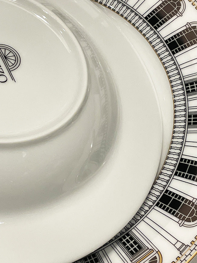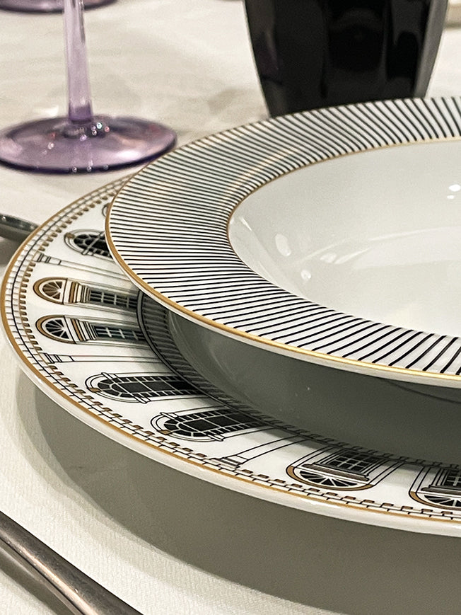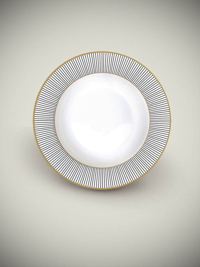 A deep porcelain plate, in an elegant design classic black and white, topped with gold, which contrasts with the architectural design of the flat plate of this collection.