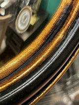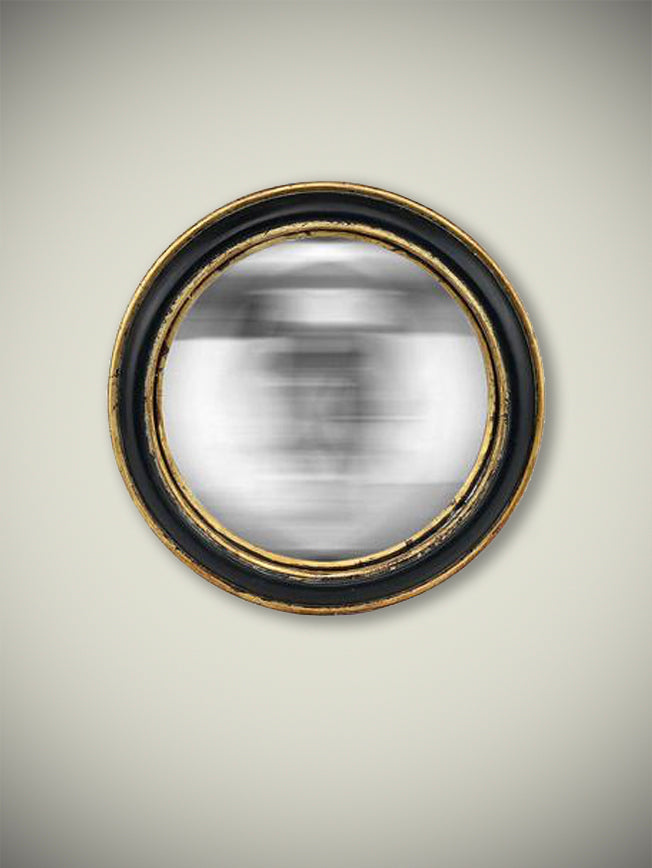 A round convex mirror with a frame in a two-tone finish in black and antique gold, in an antique style.