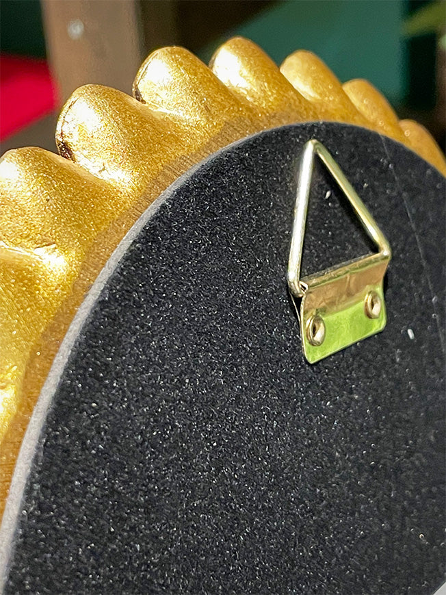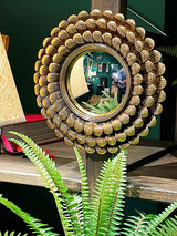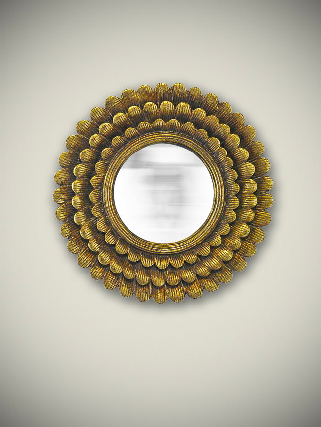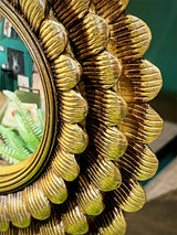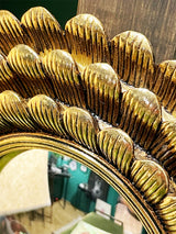 A round convex mirror in the shape of the sun with a frame in an aged gold finish, old style.