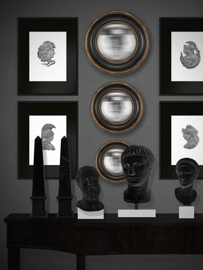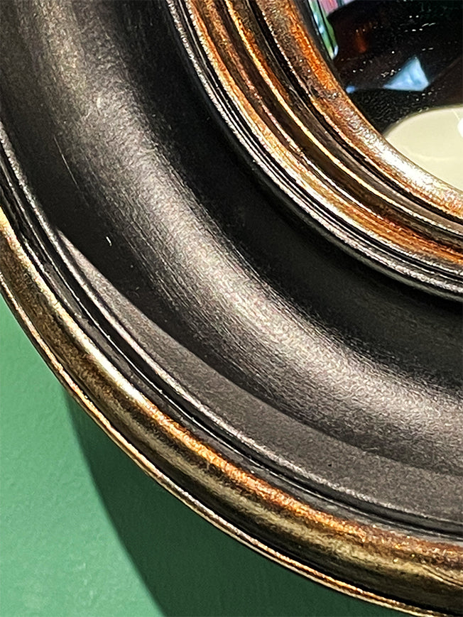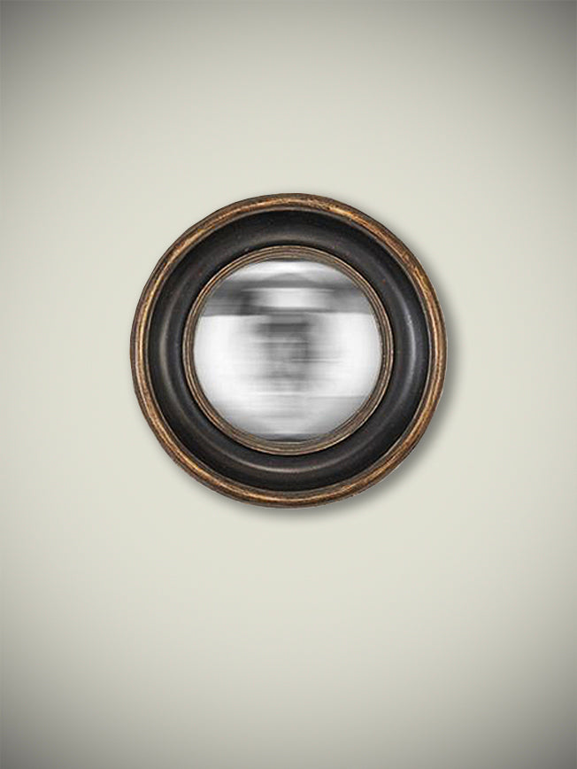 A small round convex mirror with an antique-style, antique-style two-tone black and gold finish frame.< /p>