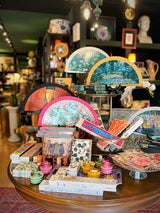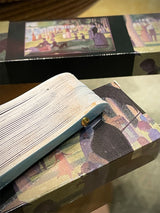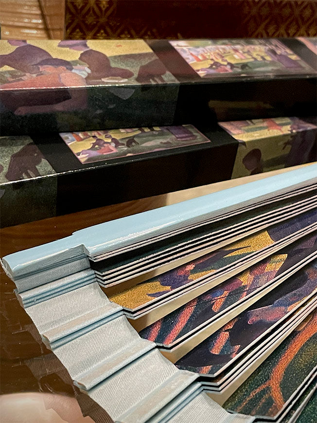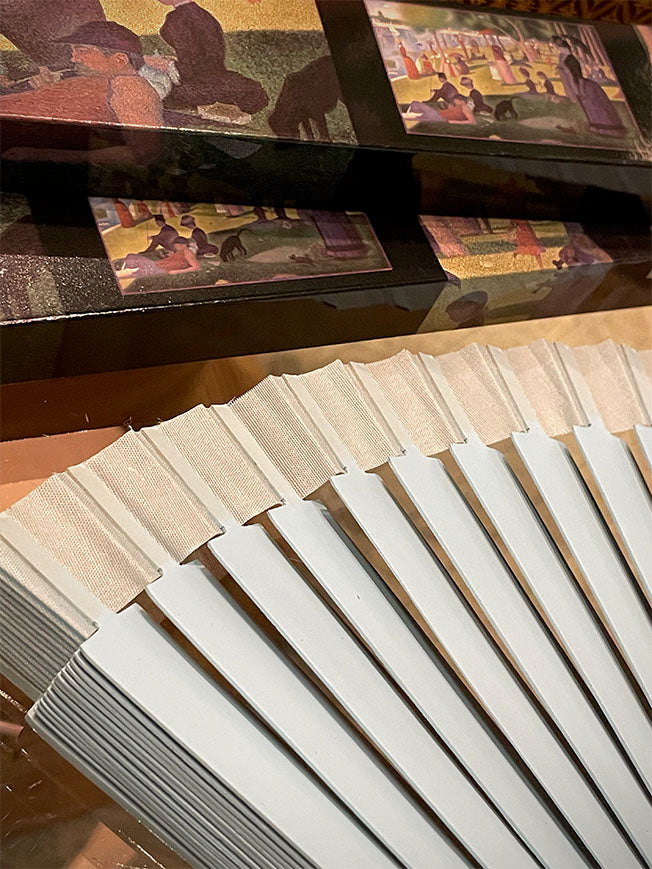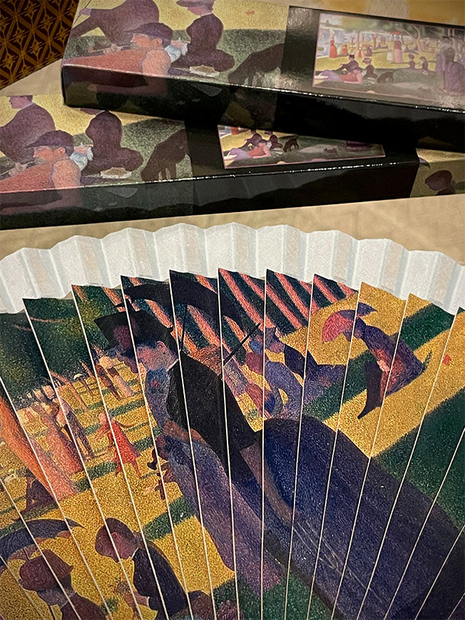 An original fan featuring a reproduction of Georges Pierre Seurat's famous 1884 painting "Sunday Afternoon on the Island of La Grande Jatte," complete with a presentation box.