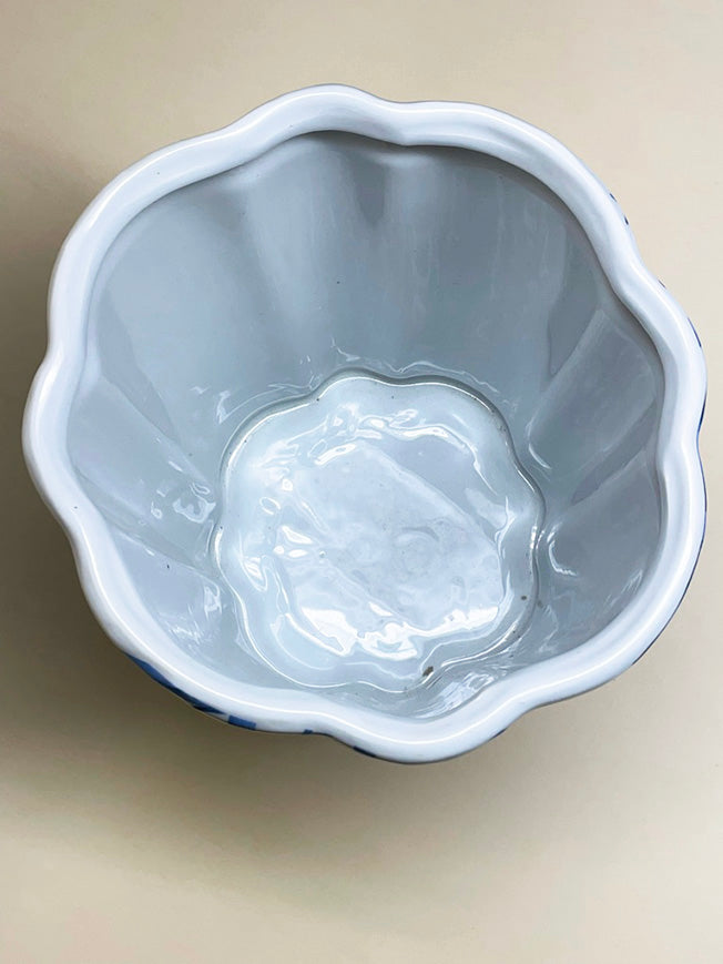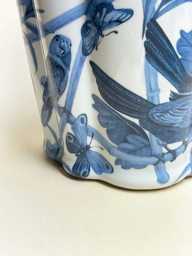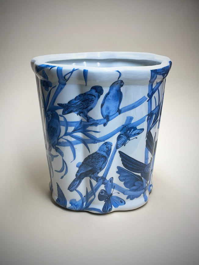 A decorative ceramic vase, with an elegant drawing of parrots and toucans in bluish tones on off-white.