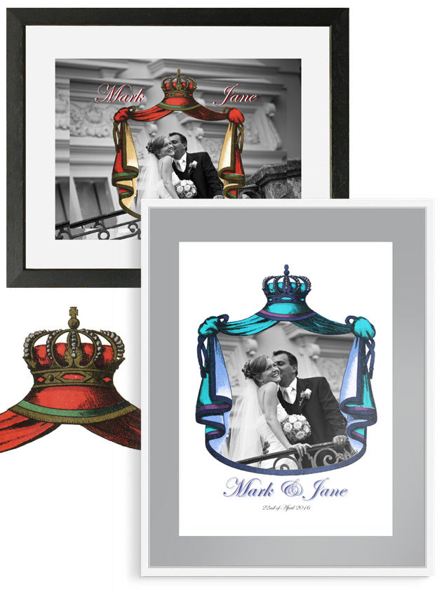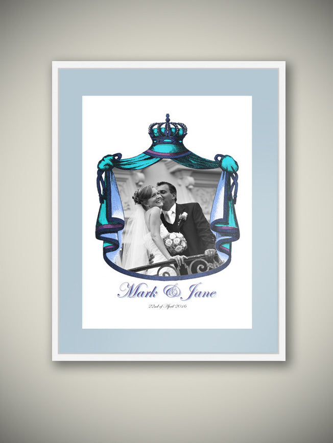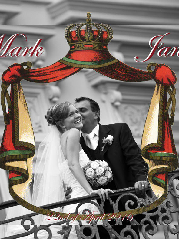 A personalized art painting with your own photograph combined with a coat of arms and crown, in red or azure blue versions. A very original wedding gift, perfect for adding your personal touch to any interior space.