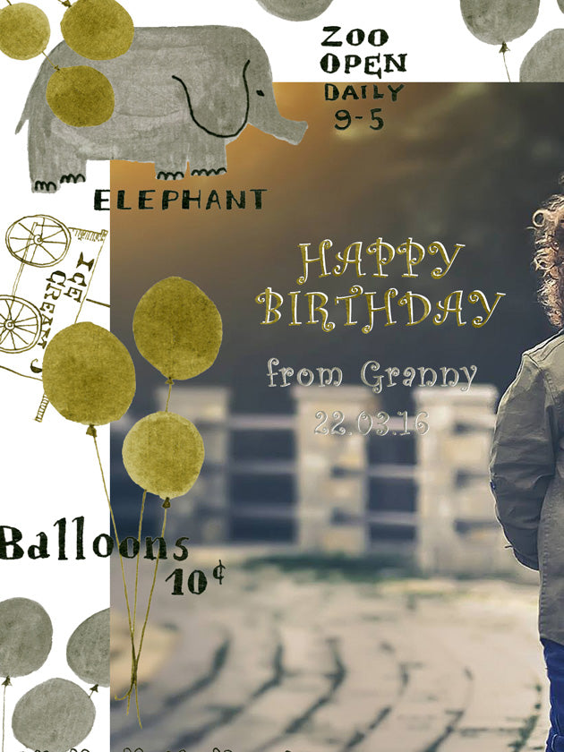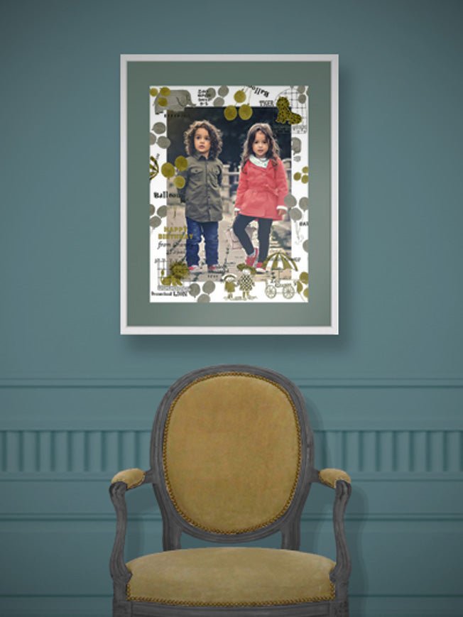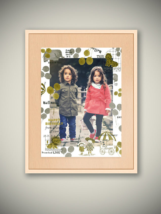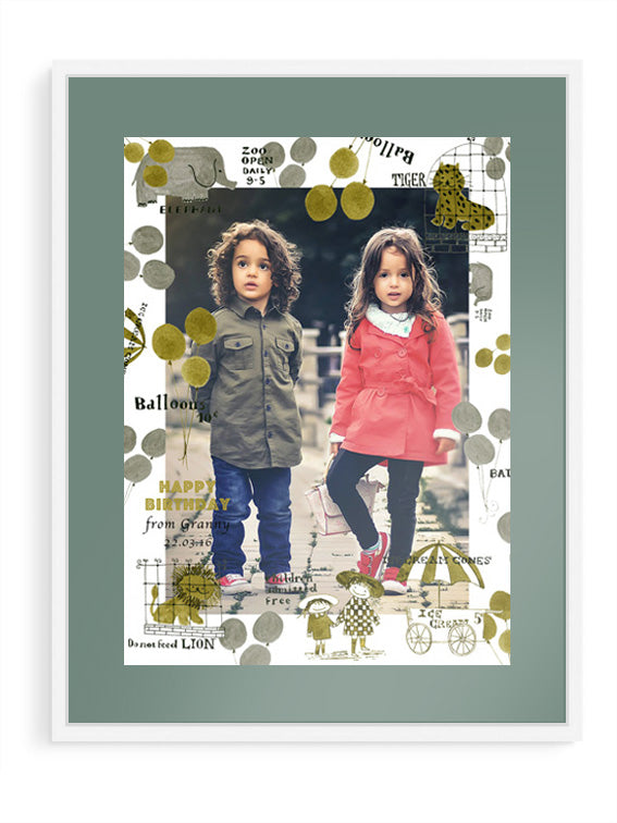 Una lámina decorativa personalizada con las fotografías de tus hijos en una composición divertida y original con un collage con distintos animales del zoológico. Un regalo para abuelos y familiares, perfecto para añadir tu toque personal a todo espacio interior.