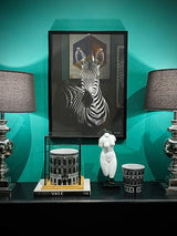 A black and white photographic print of a zebra on a black background, exquisite and of great simplicity, perfect for adding elegance and character to any interior, alone or combined with other photographs of animals from the same collection.