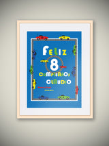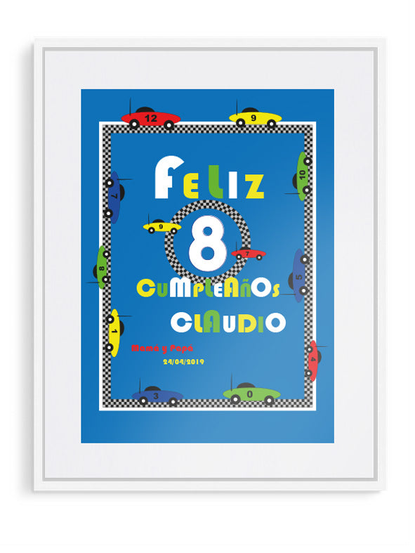 Una lámina de arte personalizada perfecta para niños, con tu propio texto y mensaje. Con un fondo colorido y un marco con coches de carreras de colores, tu mensaje personalizado va a resaltar por todo lo alto. En distintas opciones, también disponible con la tipografía del alfabeto. Con tantas opciones como te gusten. Un regalo infantil muy original perfecto para muchas ocasiones que añadirá un toque muy personal a todo espacio interior.