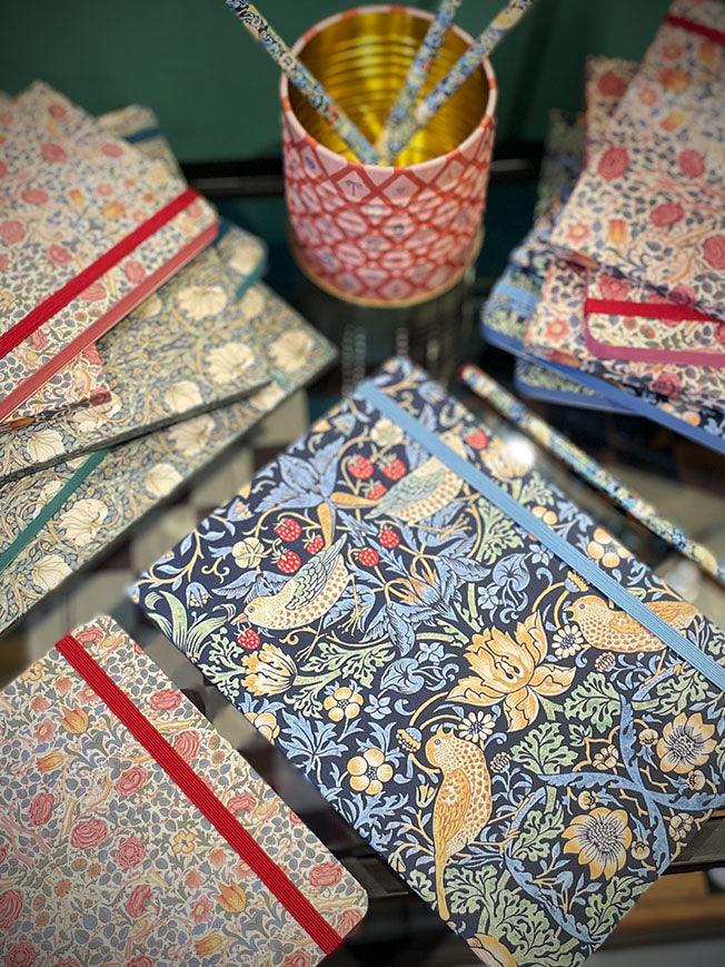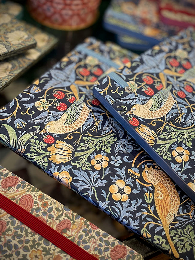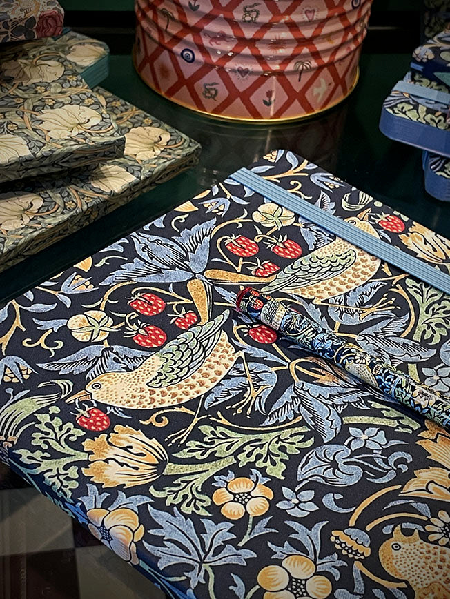 A large, original A5 notebook featuring William Morris's famous 'Strawberry Thief' floral print.