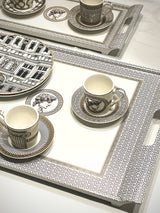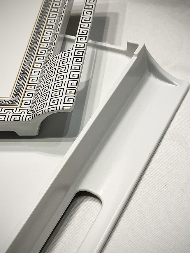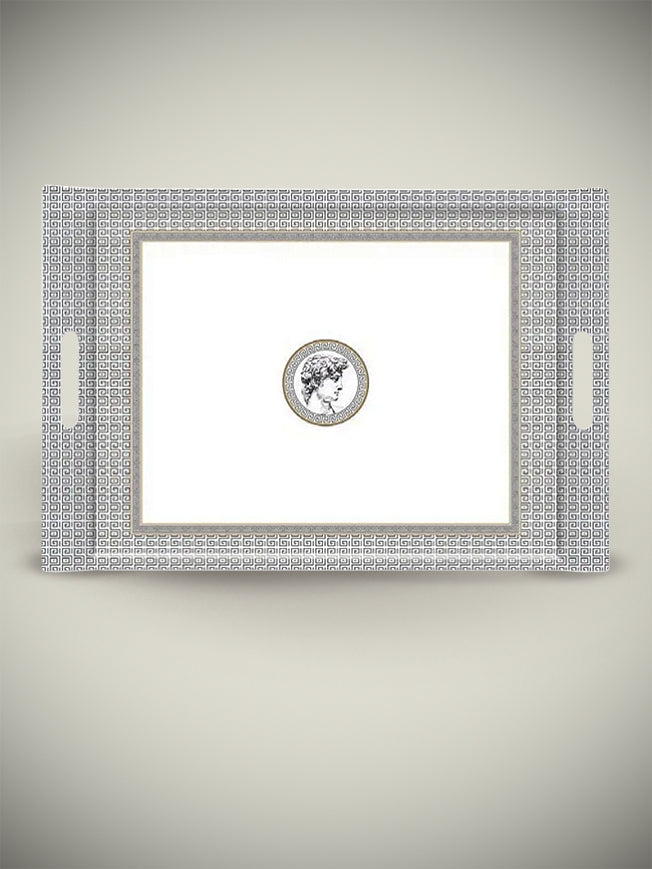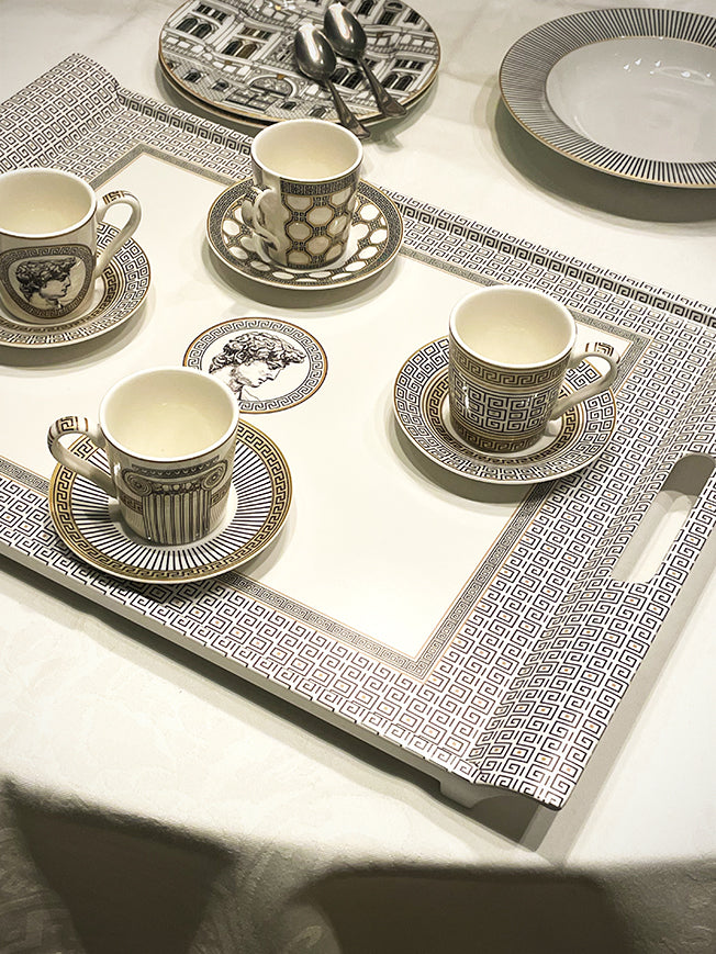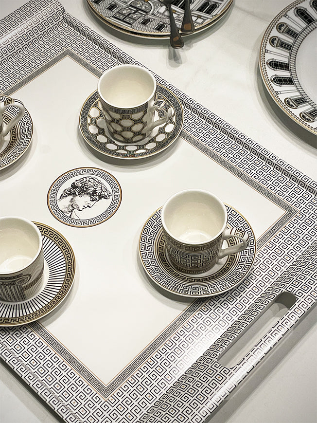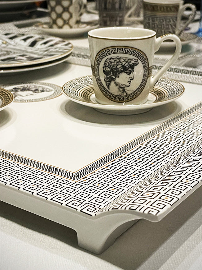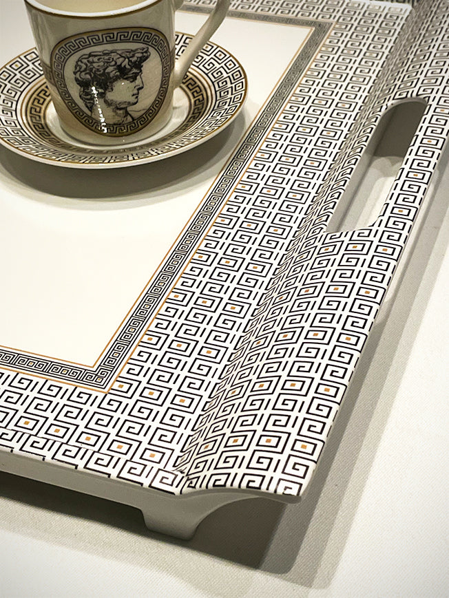A large rectangular tray in an elegant black and white Greco-Roman inspired design with gold trim.