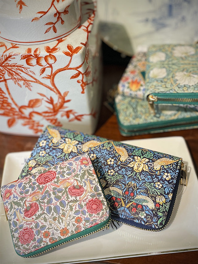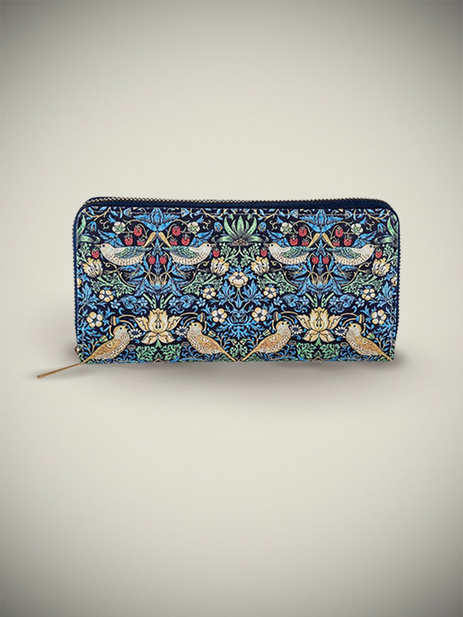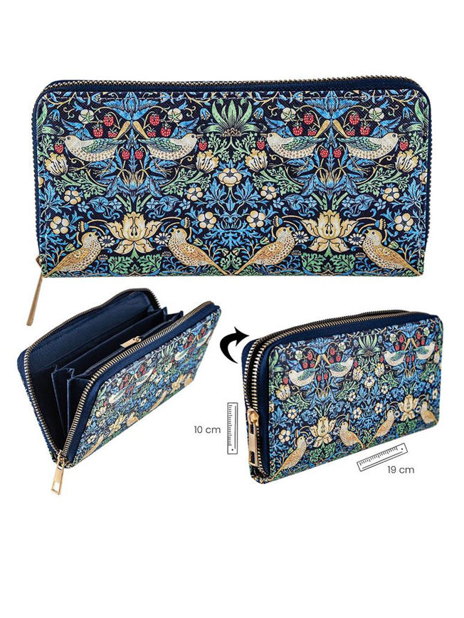 An original large wallet featuring William Morris's famous 'Strawberry Thief' floral print, with a zipper closure and multiple compartments.