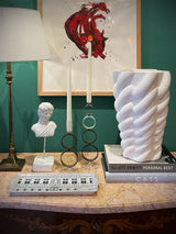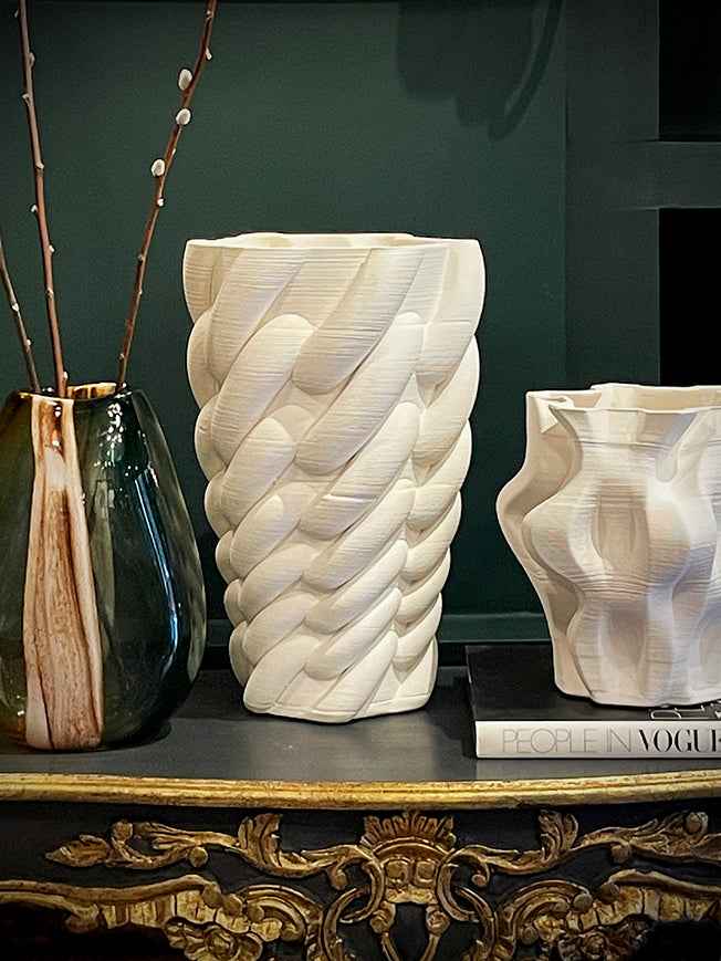 An original decorative vase with volume and organic shapes as if it were woven, made of porcelain with a natural matte texture finish, perfect for an arrangement of dried flowers or a bouquet of fresh flowers.
