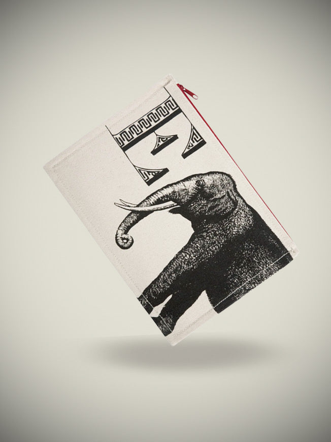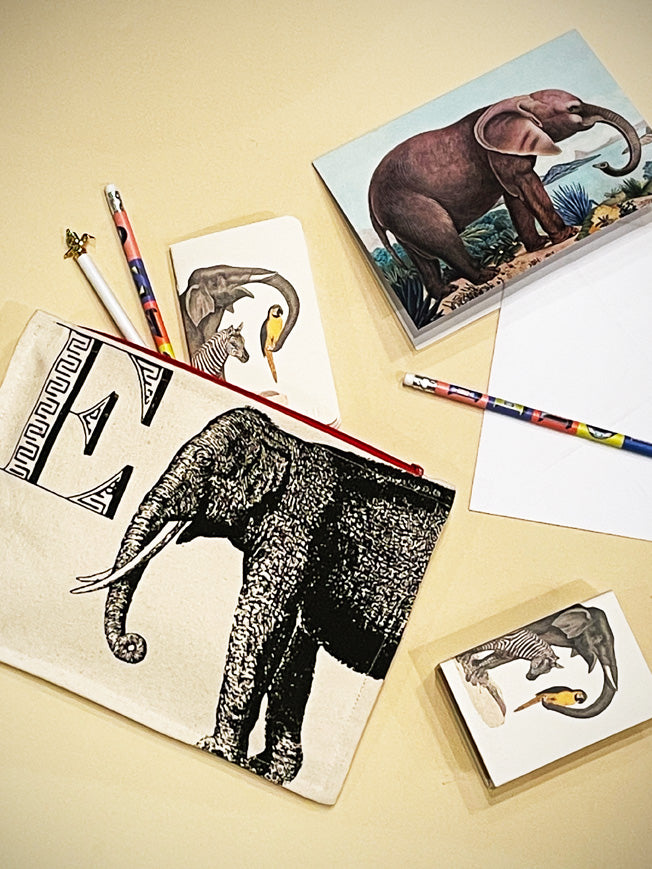 A pouch in natural linen with the letter 'E' for Elephant in vintage-style typography and an original illustration of it in black and white. On the reverse, another fabulous illustration of the logo for this collection by Thomas Paul, titled Pictorial Alphabet 'From A to Z'.