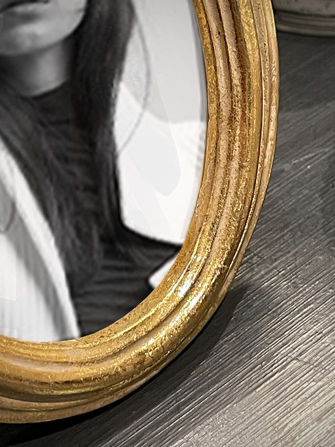 An antique-style photo frame, oval in shape and trimmed in a gold finish.