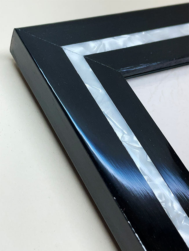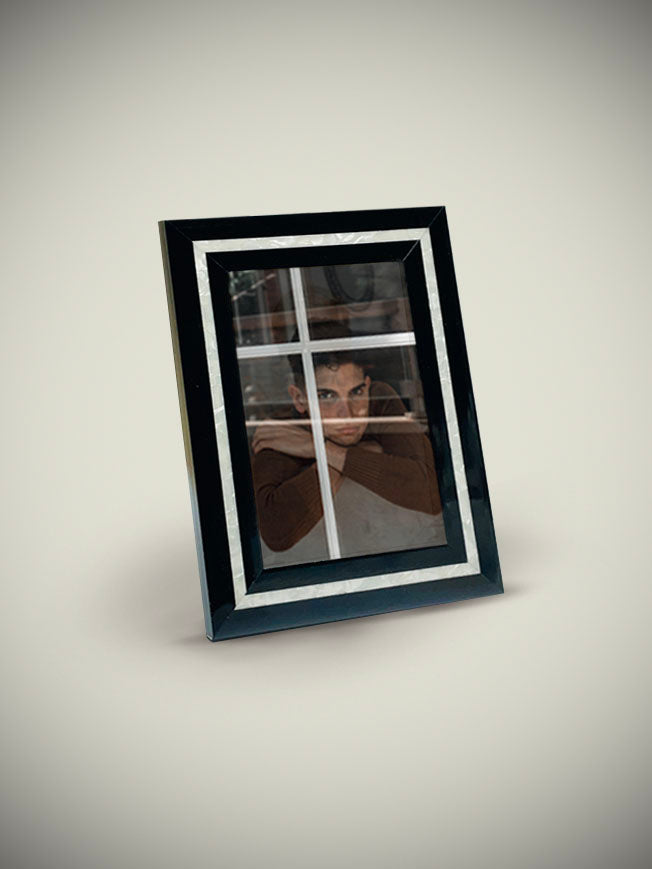 An elegant and stylized rectangular photo frame in black and off-white marquetry with a mother of pearl effect. It can be in horizontal or vertical orientation.