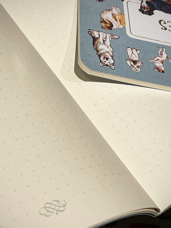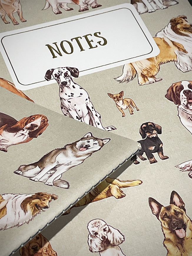 An original A5 notebook with a wonderful illustration of several dogs of different breeds on a beige background, with the Notes box in metallic gold .
