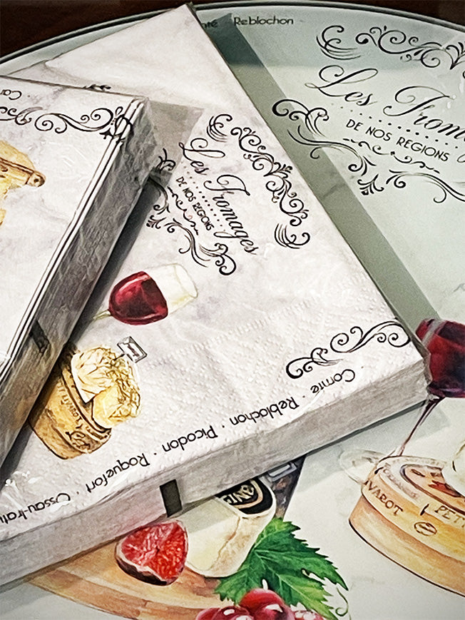 A pack of 20 paper napkins, in an original design inspired by the world of good cheeses.