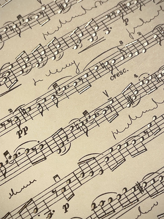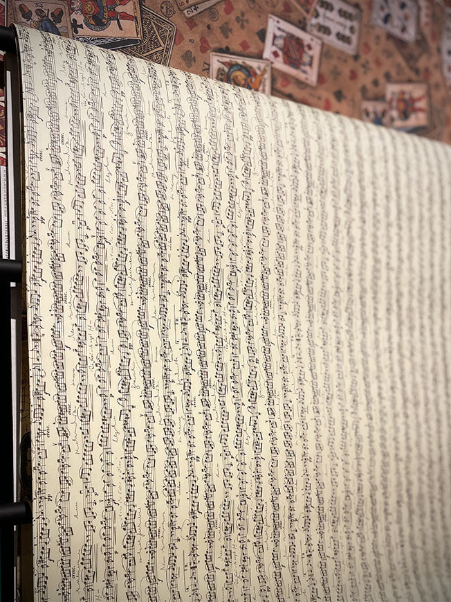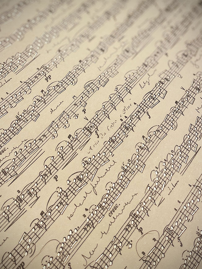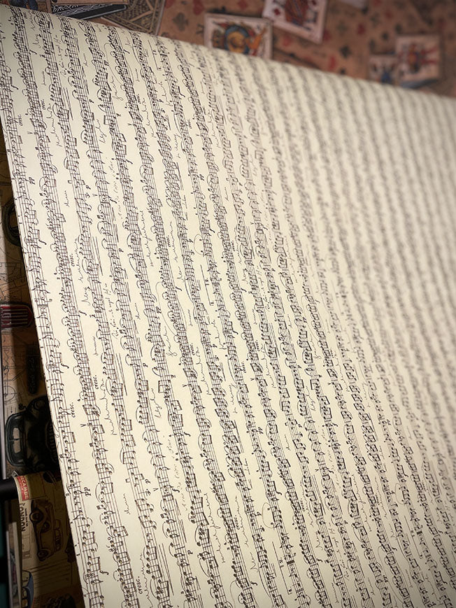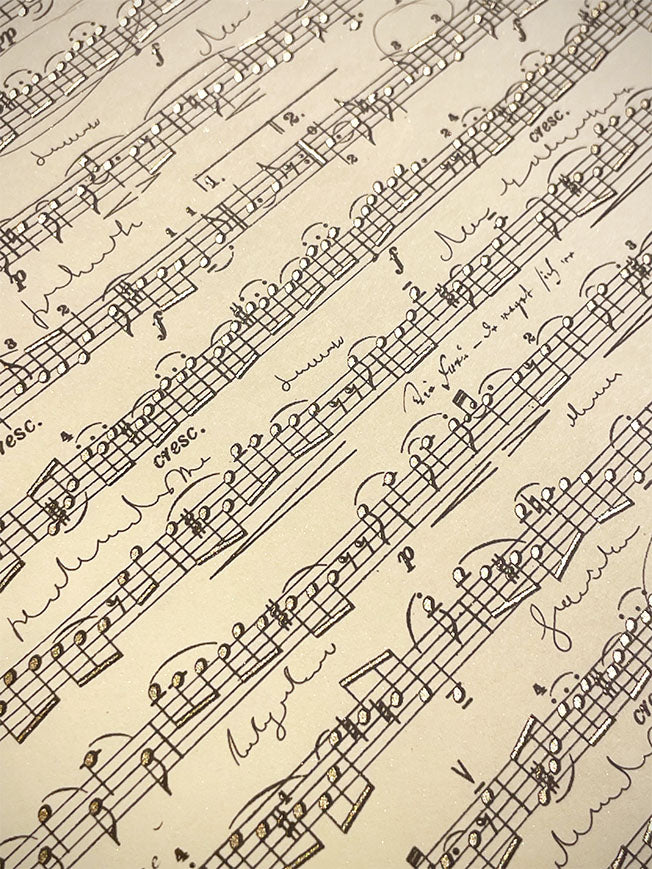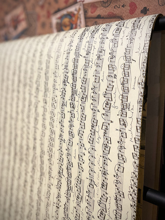 A large-format wrapping paper featuring a fabulous musical score that seems endless, beautifully detailed and imaginative, on exclusive paper with gold-dust accents.
