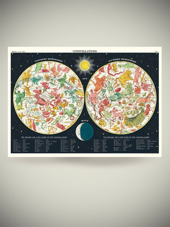 An exclusive 50 x 70 cm poster paper featuring a vintage-style design, a decorative print featuring a fabulous illustration of the constellations, the sun, the moon, and the two hemispheres. With a very retro feel, it's part of the exclusive collection of papers and accessories from Cavallini Papers & Co., established in San Francisco since 1989.