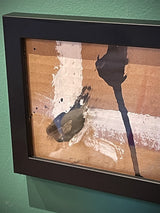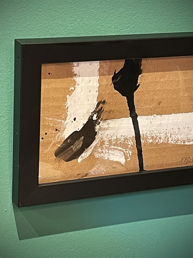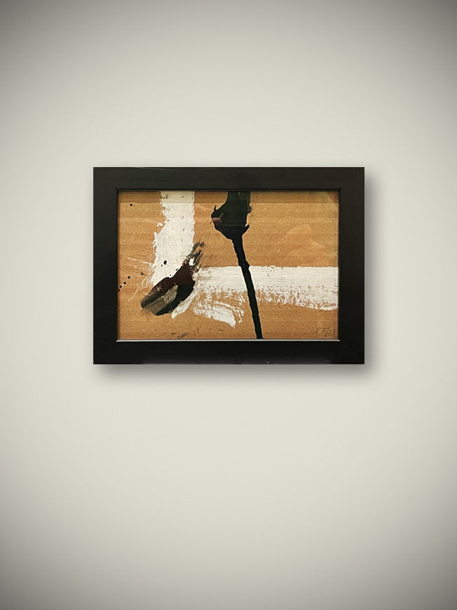 Small original abstract painting in an elegant black and white composition that contrasts richly against a tan kraft background.