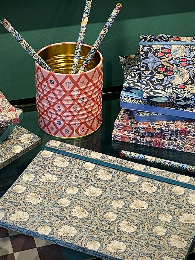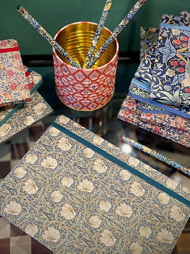 An original A5 notebook featuring William Morris's famous 'Pimpinella' floral print.