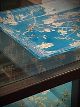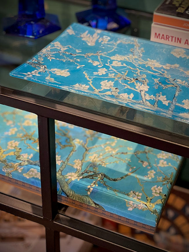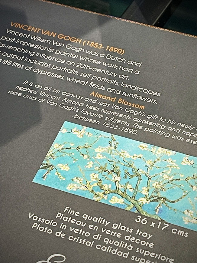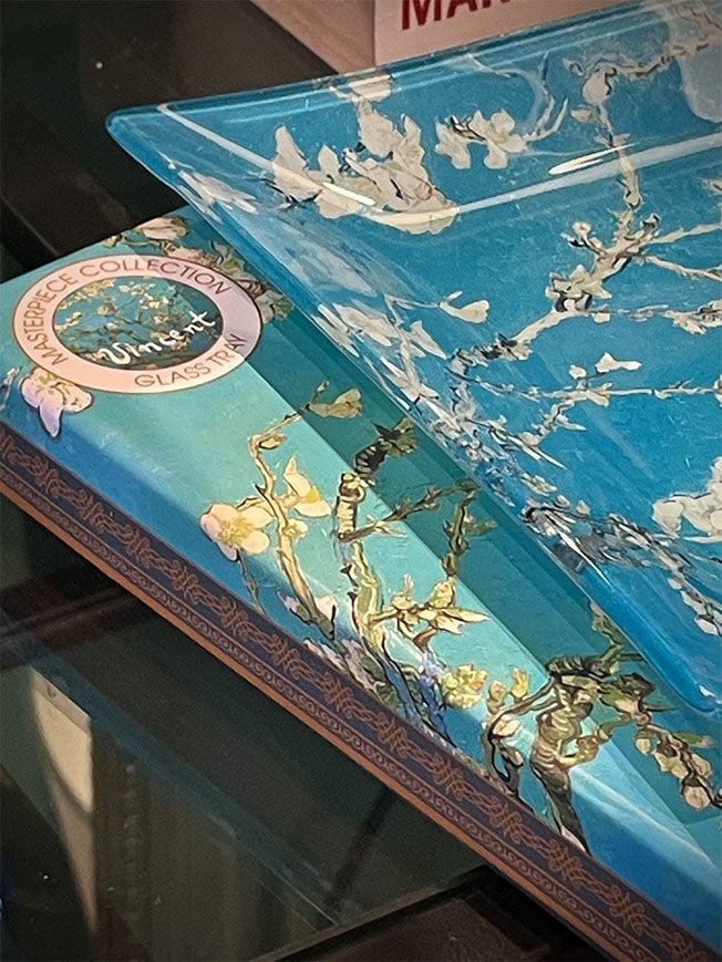 A rectangular glass tray featuring Vincent Van Gogh's famous painting 'Almond Blossom', with a presentation box that makes it ideal for gifting.