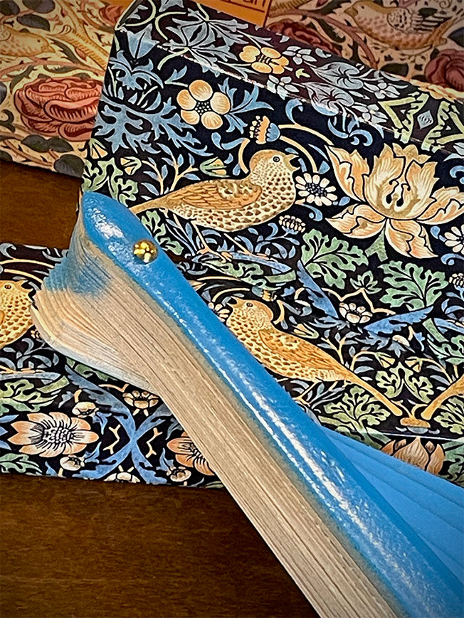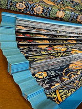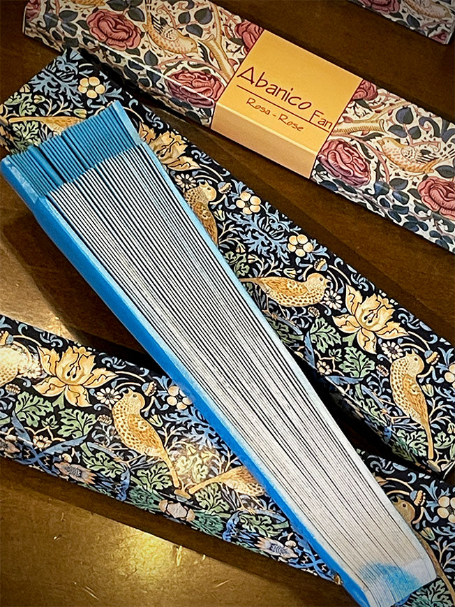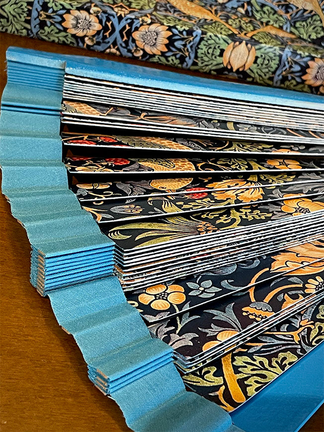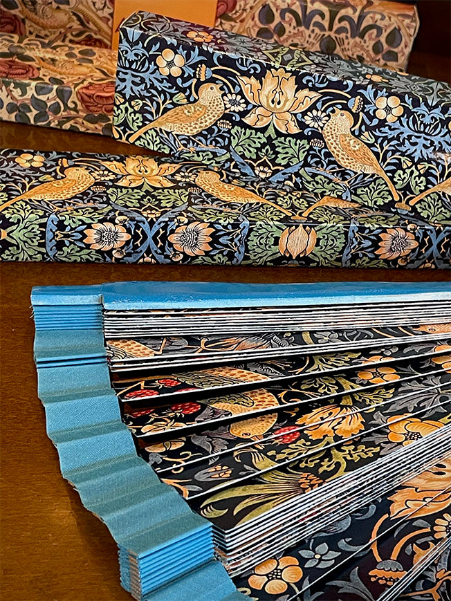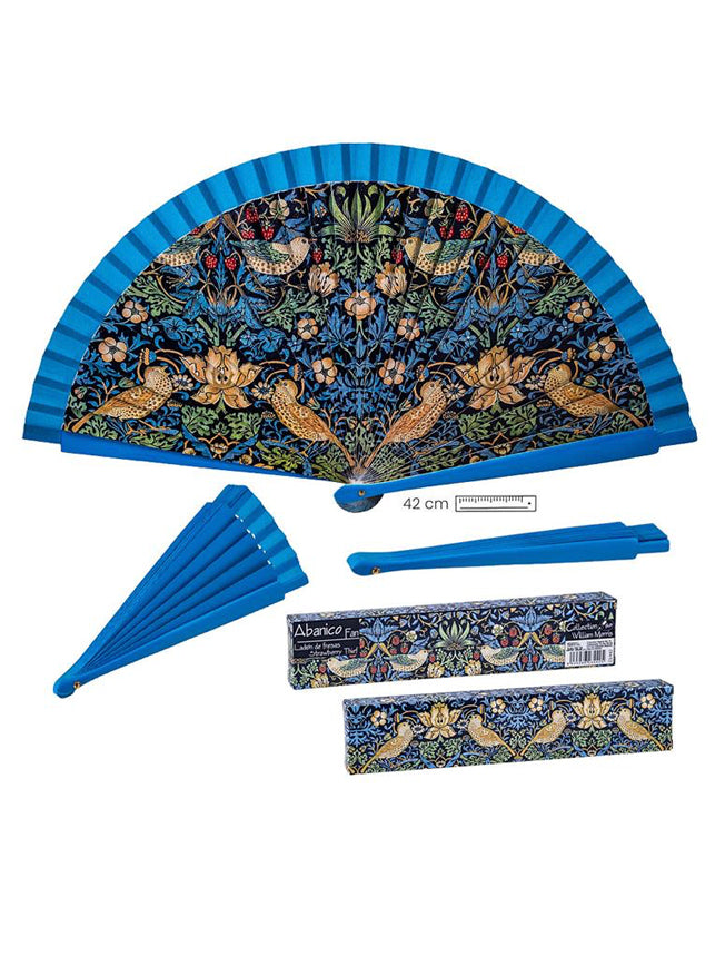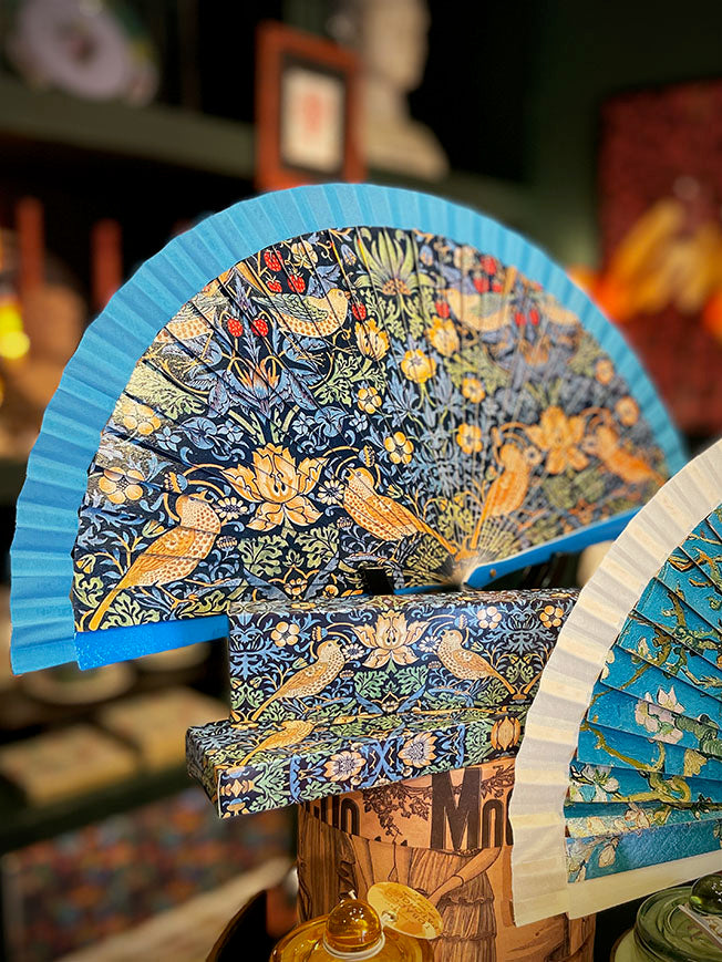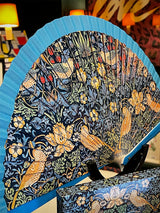An original fan featuring a reproduction of William Morris's famous 'Strawberry Thief' print, with a presentation box.