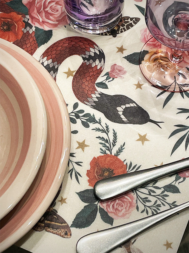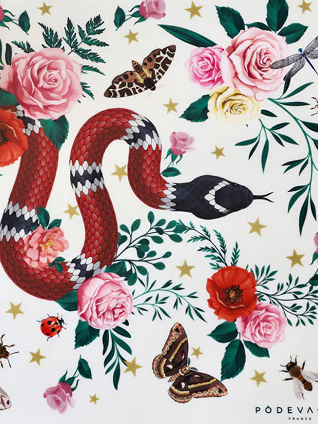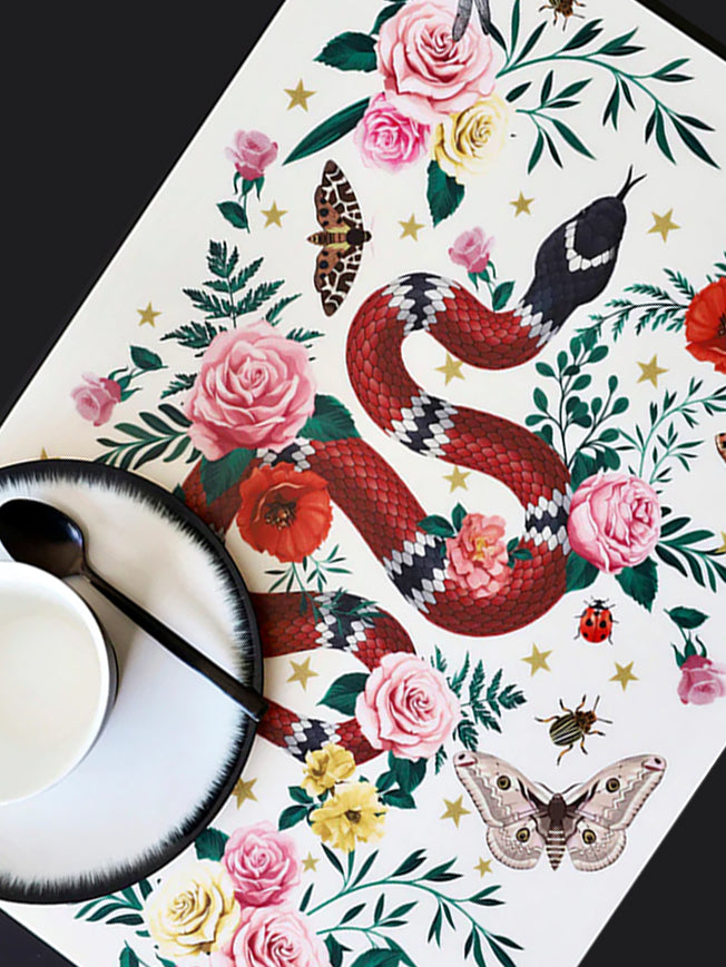 A high-quality vinyl table placemat inspired by a collection of Old School< tattoos em data-mce-fragment="1">, with a striking snake in the center and a collage of flowers and butterflies. Rectangular in shape, it is durable and easy to maintain. Provides a stain-resistant and waterproof surface, making it perfect for everyday use.