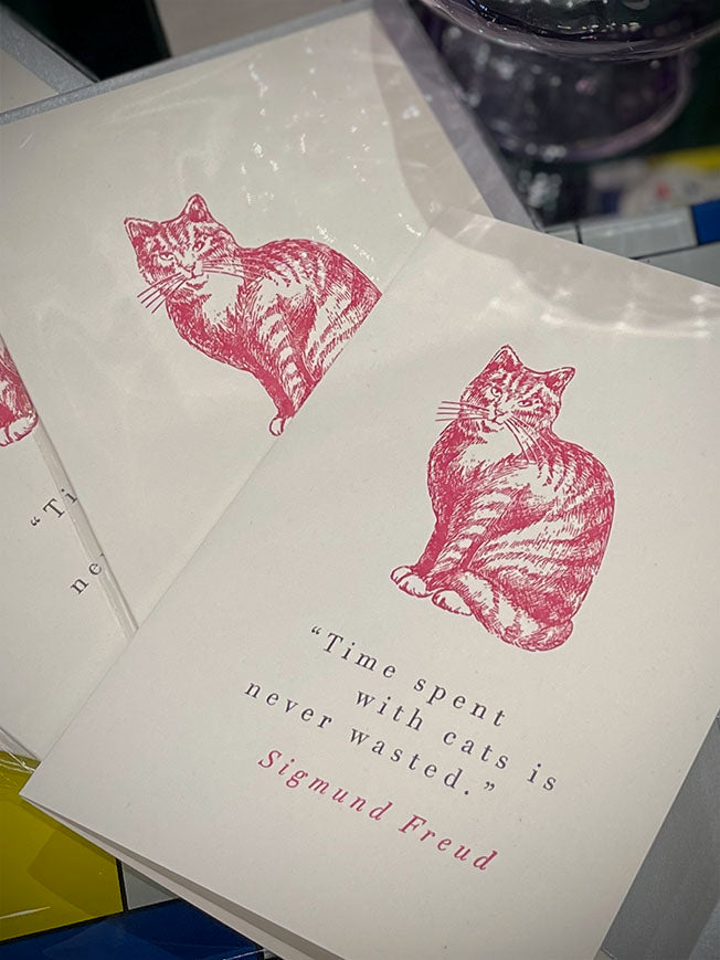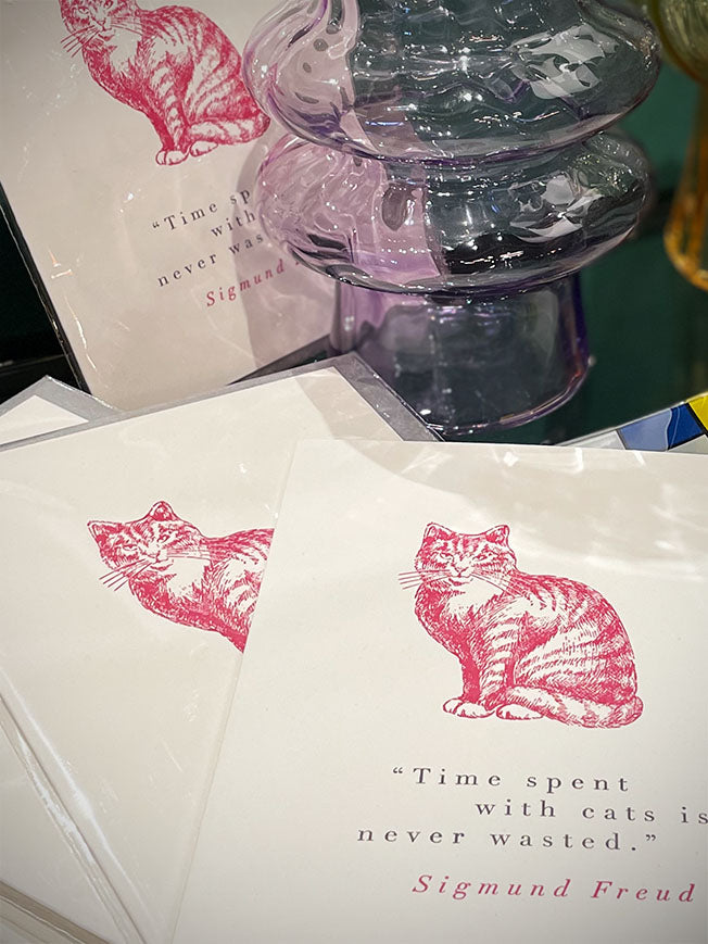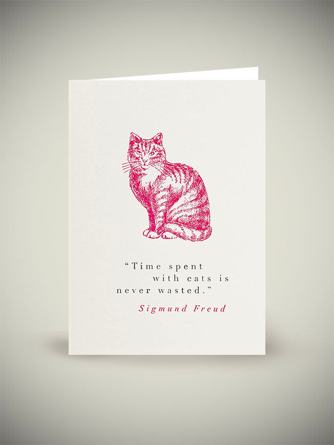 Una fabulosa tarjeta de felicitación con la ilustración de un fabuloso gato en color rosa y el ingenioso mensaje 'Time spent with cats is never wasted - Sigmund Freud'. Un diseño original del artista artista J.Falkner para la imprenta Archivist, en Oxfordshire.