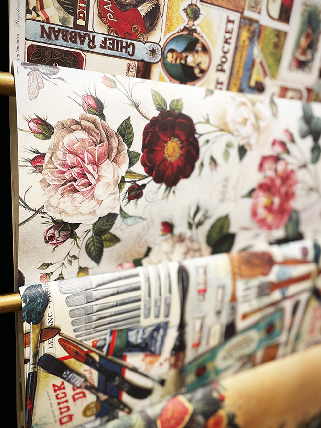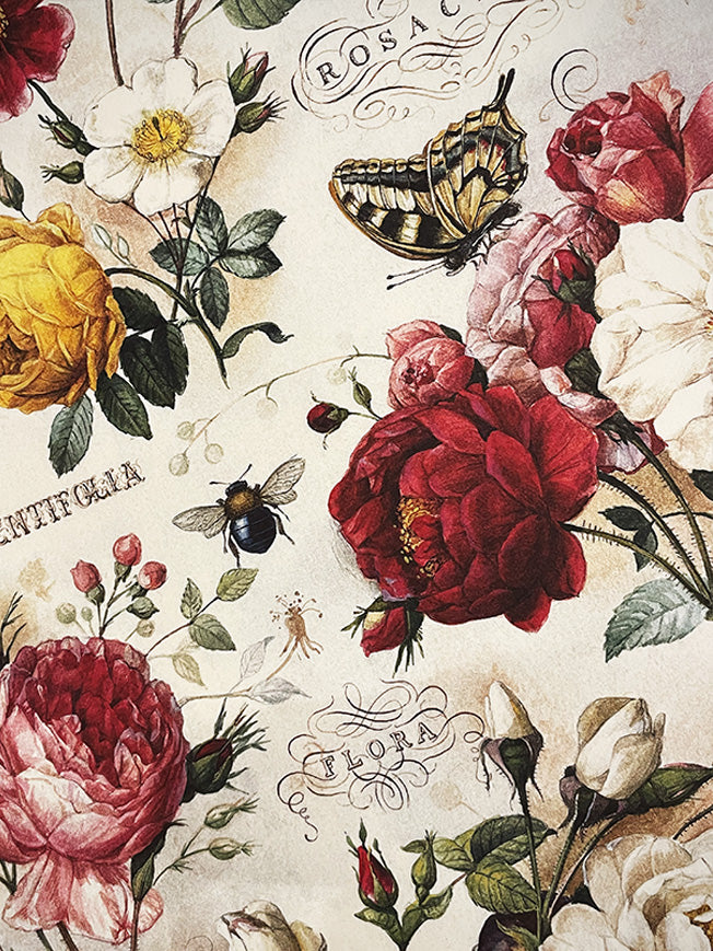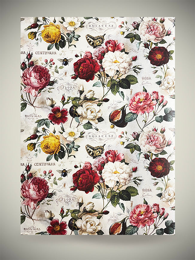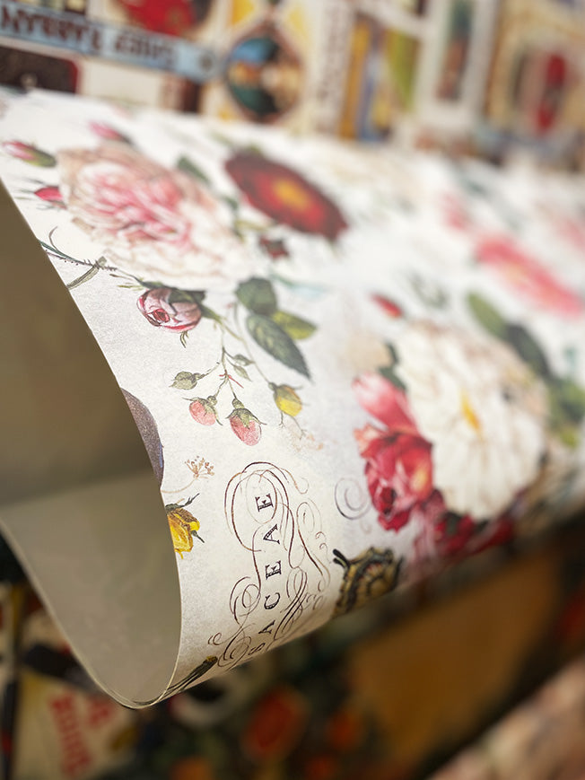 A large format wrapping paper with a fabulous illustration of delicate roses in a classic English style composition, with lots of color, detail and totally irresistible for fans of floral prints.