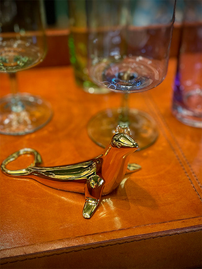 Un original abridor de botella en forma de foca en acero en acabado dorado brillante que añadirá un toque divertido y sofisticado en la mesa y en tu mueble bar.