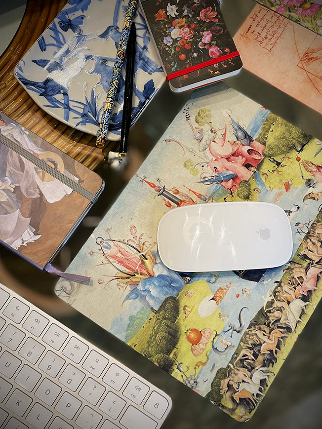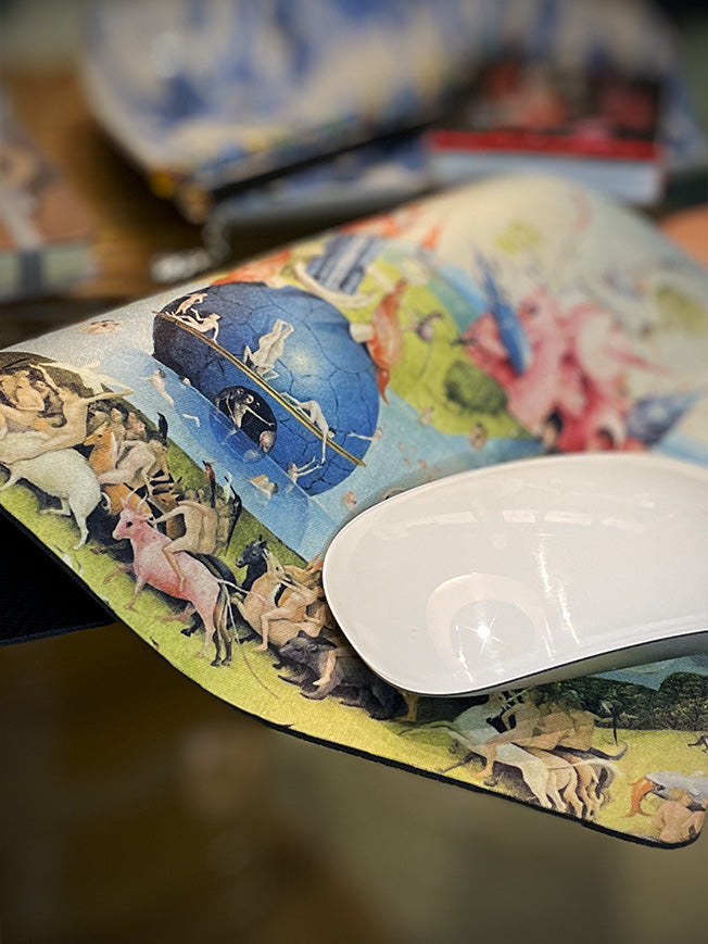 Una elegante alfombrilla para ratón con la famosa obra de El Bosco 'El Jardín de Las Delicias' en una ligera superficie de microfibra sobre base de caucho.