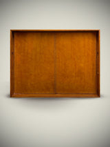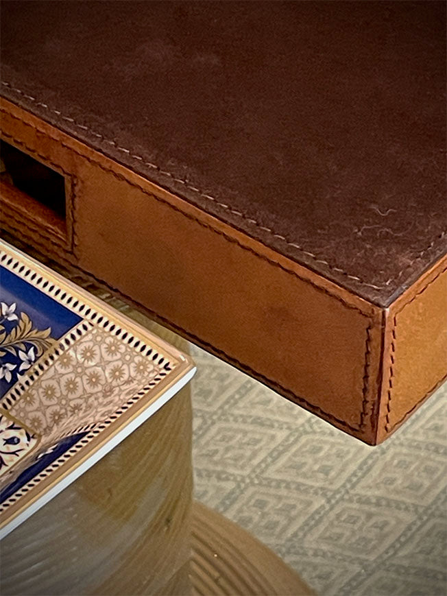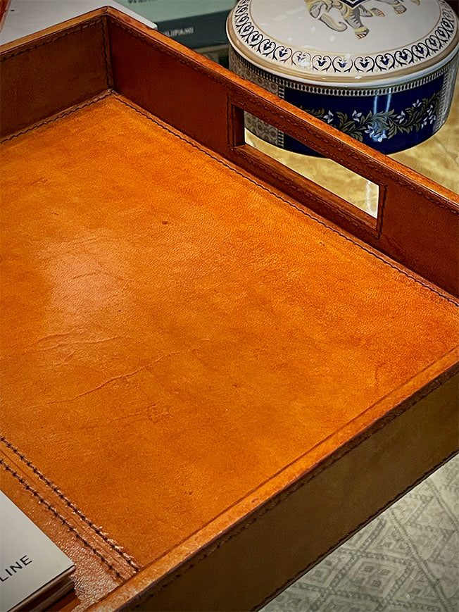 Una bandeja decorativa rectangular en piel con un elegante acabado cosido a mano, con asas.