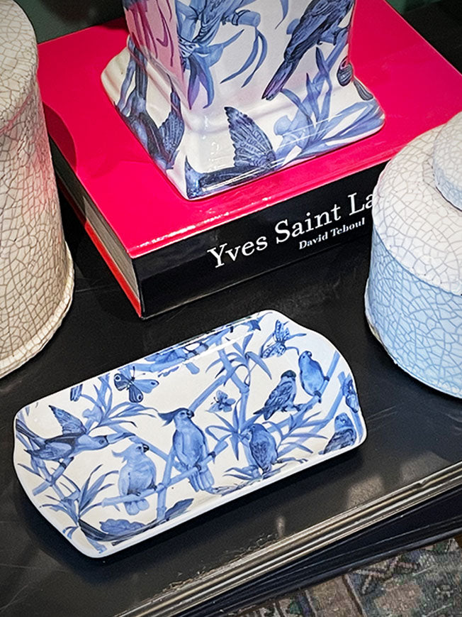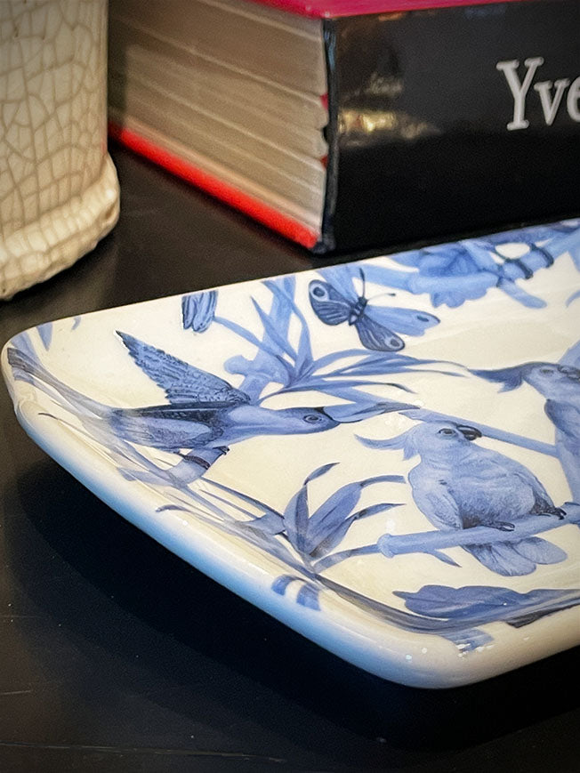 Una bandeja decorativa pequeña de cerámica, con un elegante dibujo de loros y ramas en azul y blanco.