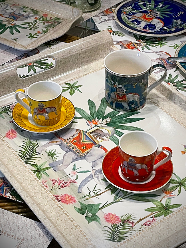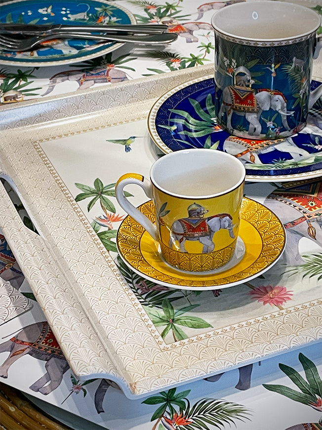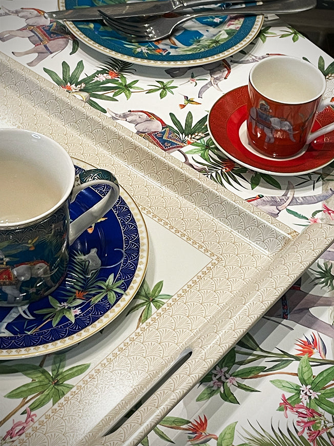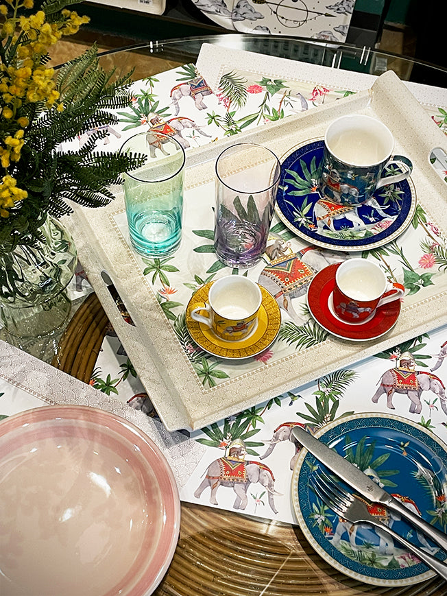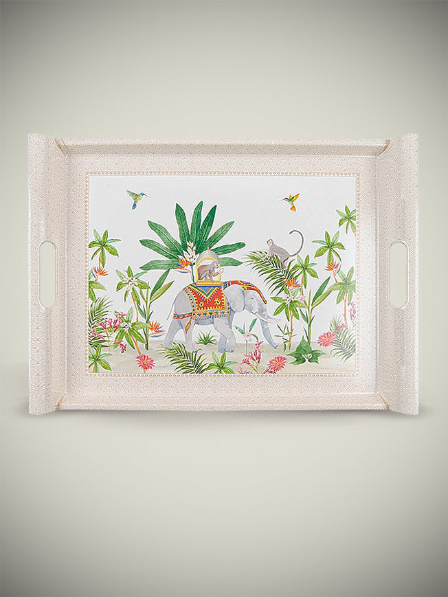 Una bandeja de servir rectangular de tamaño grande, con un estampado clásico y colorido con elegantes ilustraciones de elefantes y monos, inspirados en la India y su tradición.