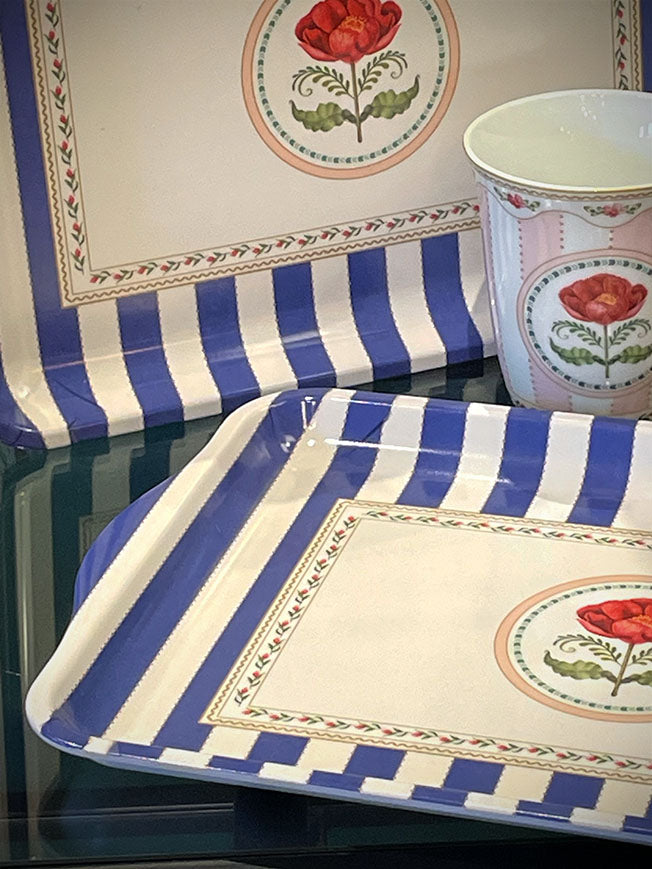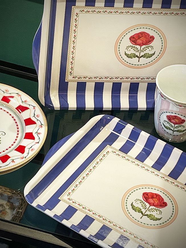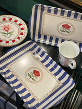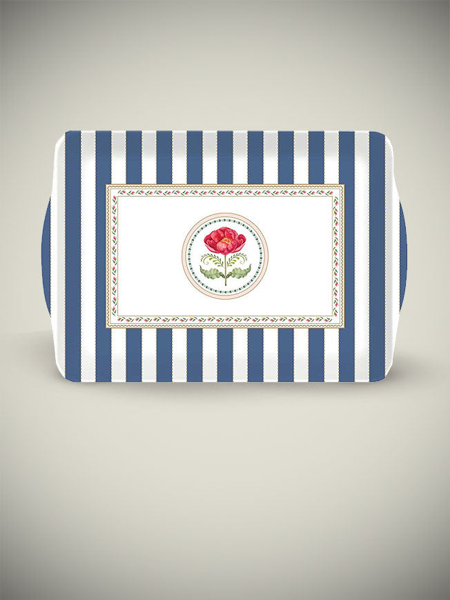 Una bandeja de servir rectangular de tamaño pequeño, en un diseño clásico con rayas azules y una bonita flor como motivo central.