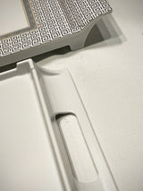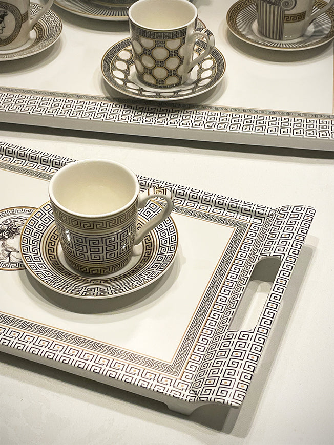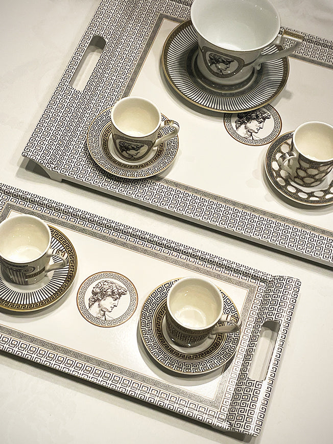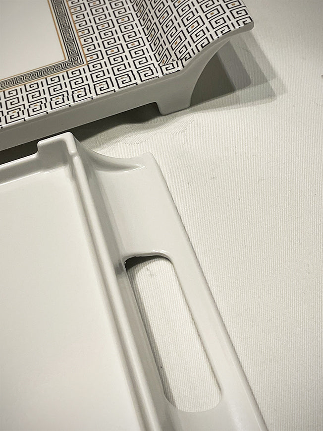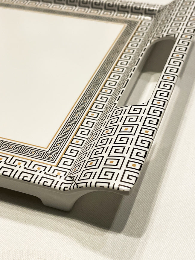 Una bandeja rectangular de tamaño pequeño en un elegante diseño de inspiración greco romana en blanco y negro y remates en dorado.