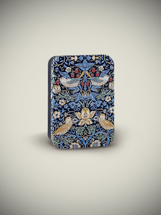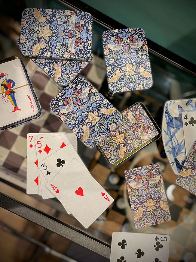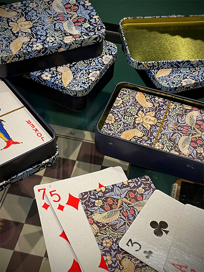 Una caja de lata con el famoso estampado 'Strawberry Thief' de William Morris con una baraja de cartas de poker, con el reverso en el mismo estampado.