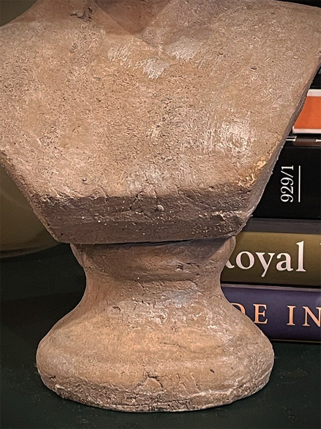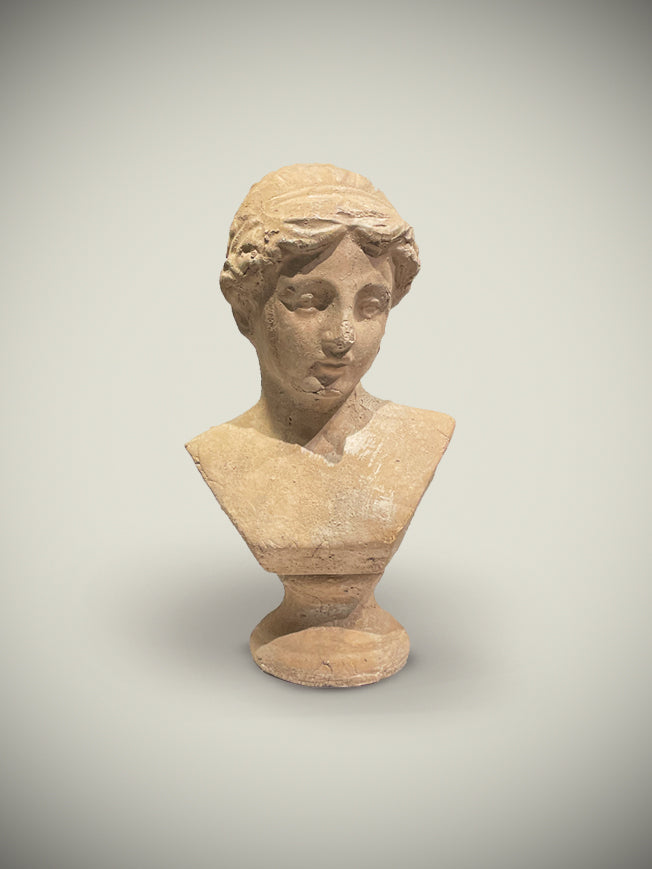 Un busto decorativo femenino inspirado en los clásicos de la época romana en un acabado de efecto lavado terracota, en un material mezcla de resina y yeso.
