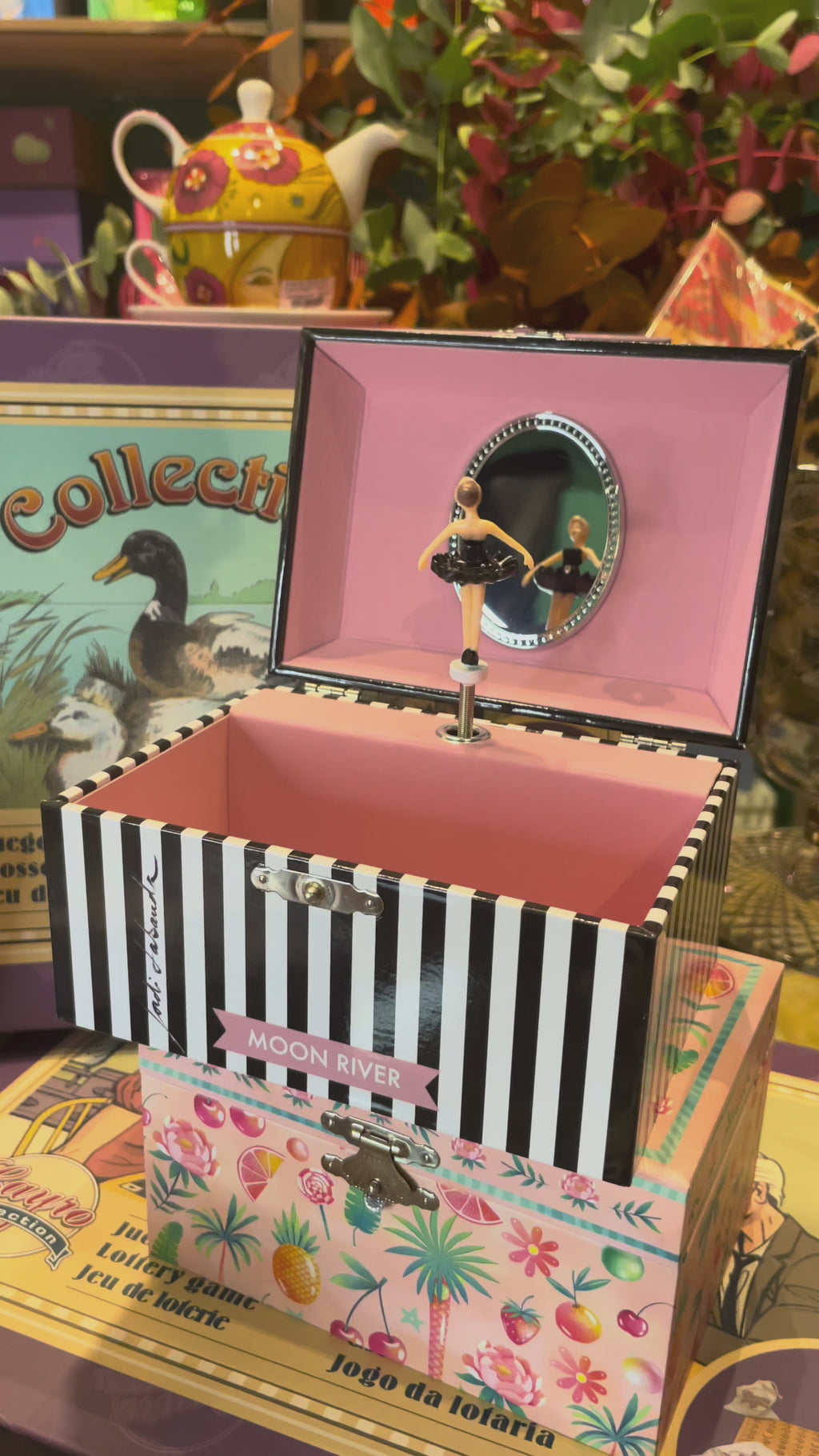 Una bonita caja de música con bailarina en su interior, en un estiloso diseño de Jordi Labanda inspirado en la película Desayuno con Diamantes, con la ilustración de Audrey Hepburn sobre un fondo a rayas negras y blancas y el título de la melodía Moon River, que suena al abrirse la caja.