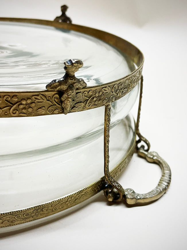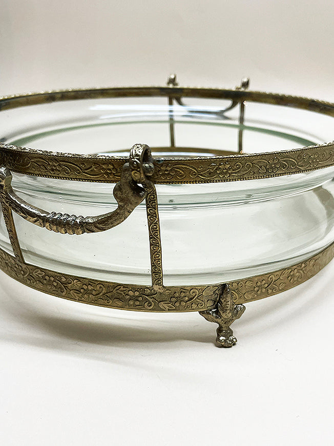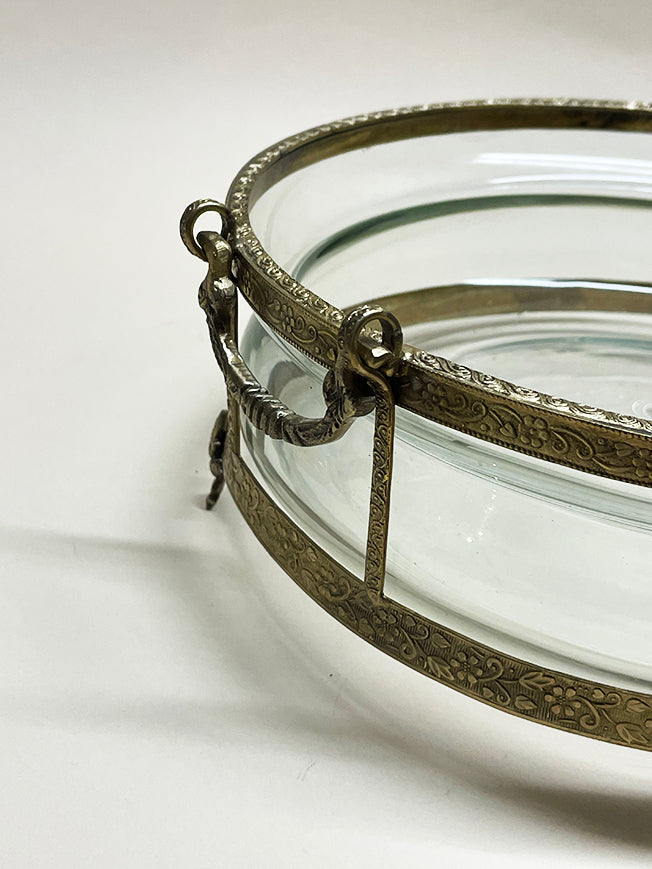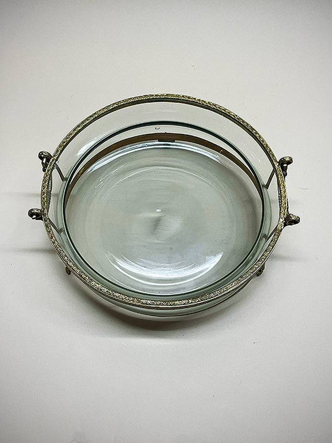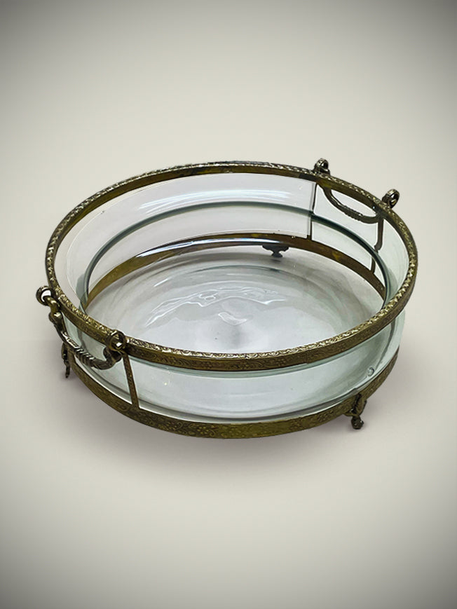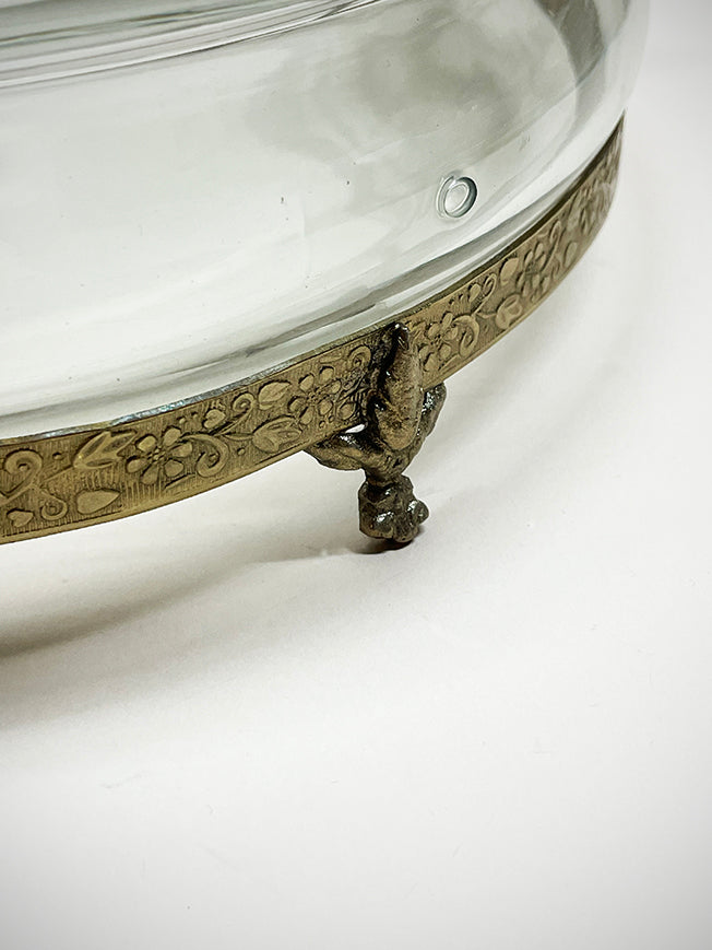 Un centro redondo de cristal sobre una base en metal dorado trabajado, con delicadas patas y asas, en un acabado dorado envejecido.