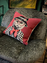 Una funda de cojín decorativo muy original con el retrato de un adorable gato British Shorthair recreado como Coco Chanel, sobre un fondo burdeos.