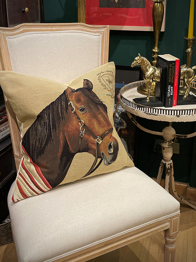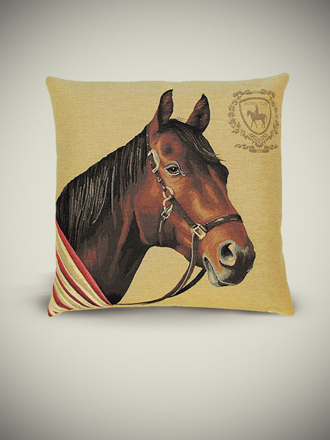 Una funda de cojín decorativo muy original con la cabeza de un caballo marrón y el escudo Royal Club en una esquina, sobre un fondo beige.