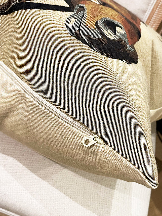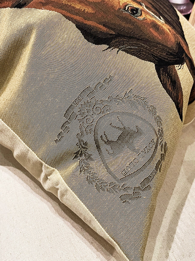 Con cierre de cremallera y relleno de pluma opcional, este elegante cojín está tejido en jacquard belga después de un laborioso proceso de escaneo y reelaboración de la imagen para el posterior tejido con hilo 100% algodón.