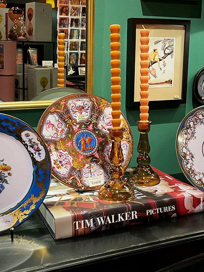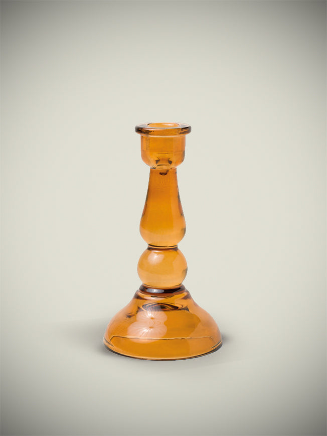 Un candelabro de cristal de color ámbar, de diseño ligero y contemporáneo, ideal combinado con otros candelabros de colores de la misma colección.