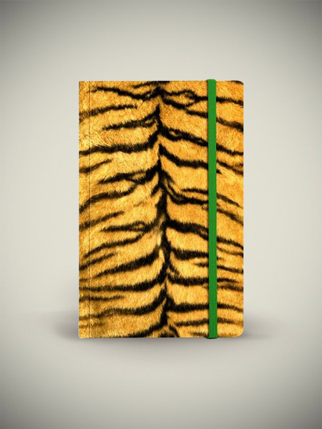 Un original cuaderno pequeño de formato A6 en un atractivo estampado animal de tigre y cierre elástico en verde loro.