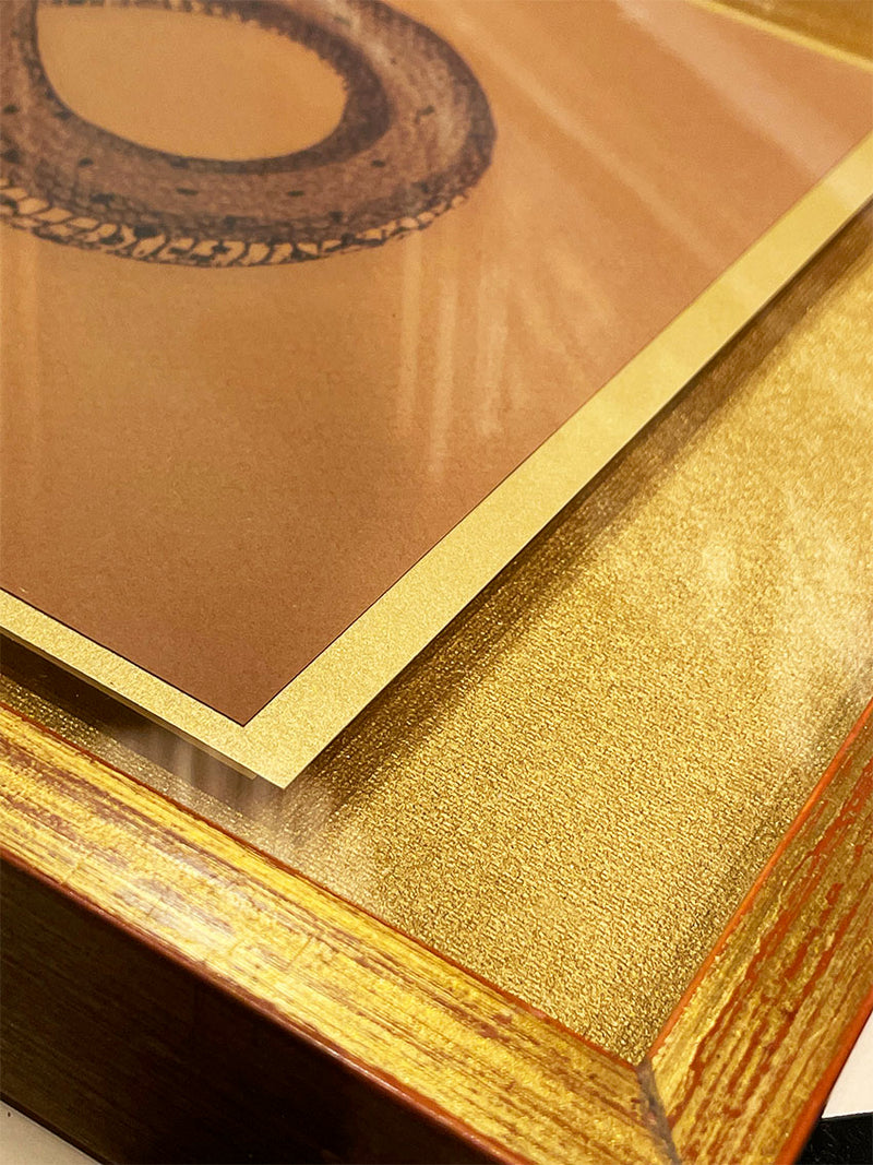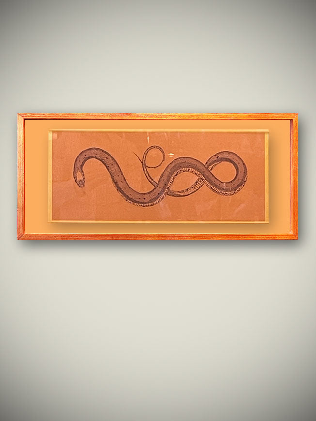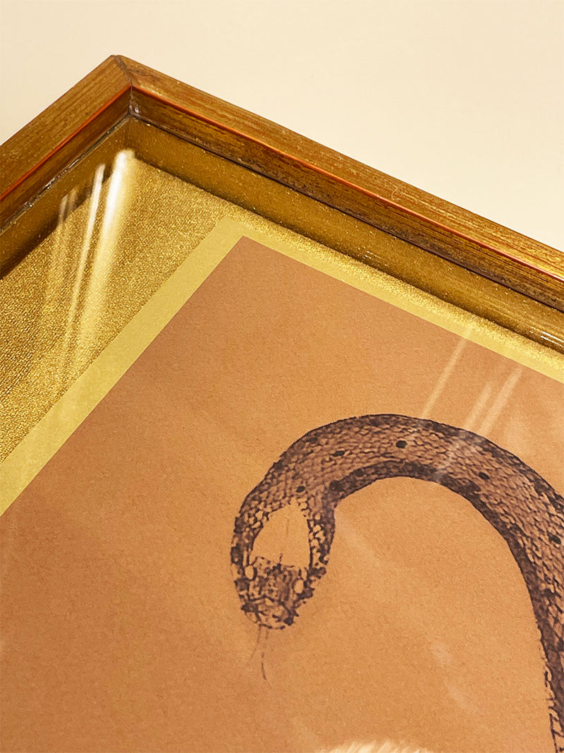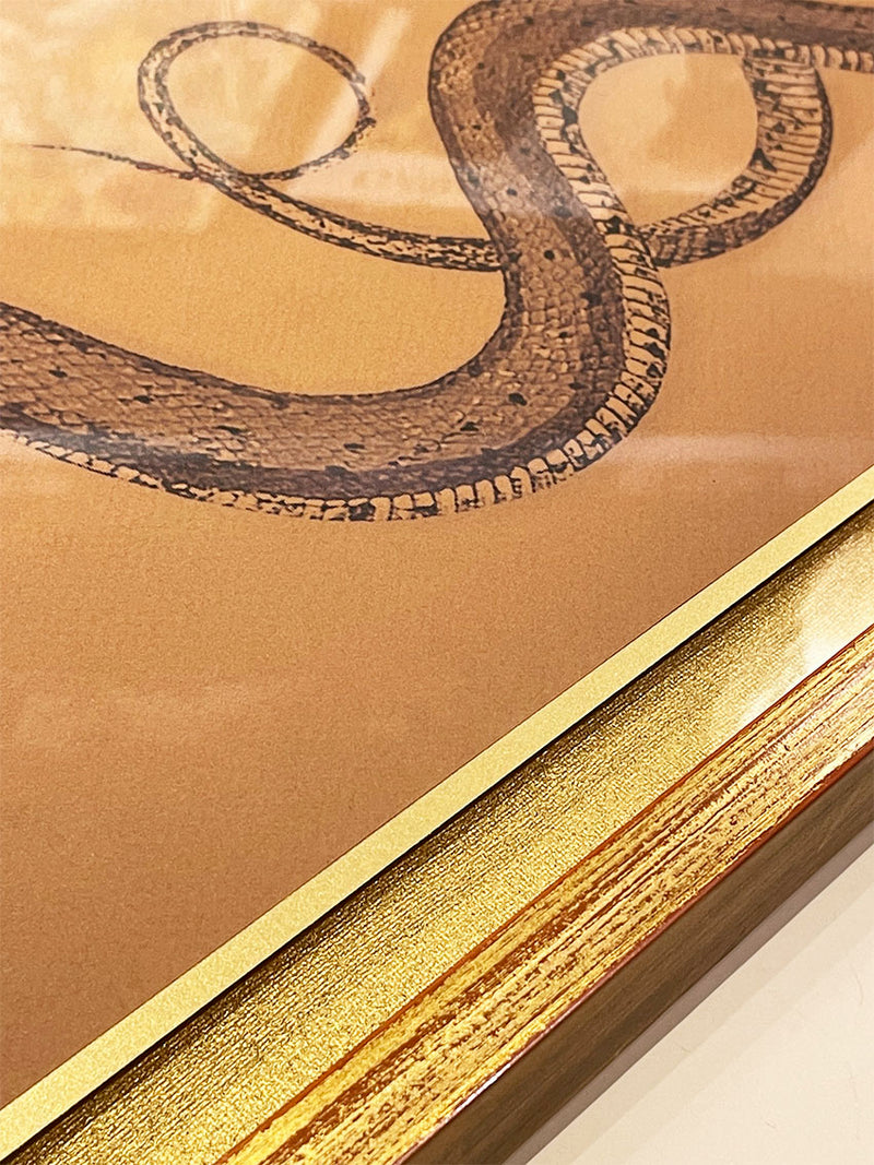 Un cuadro decorativo muy original con la ilustración de una serpiente sobre papel de textura en color tabaco, montado sobre cartulina dorada y enmarcado con un efecto flotante.