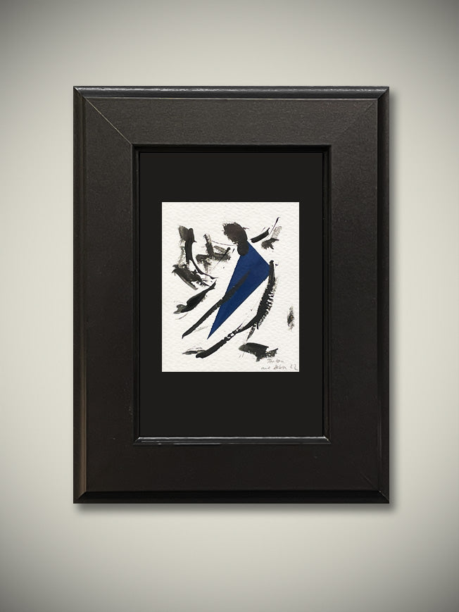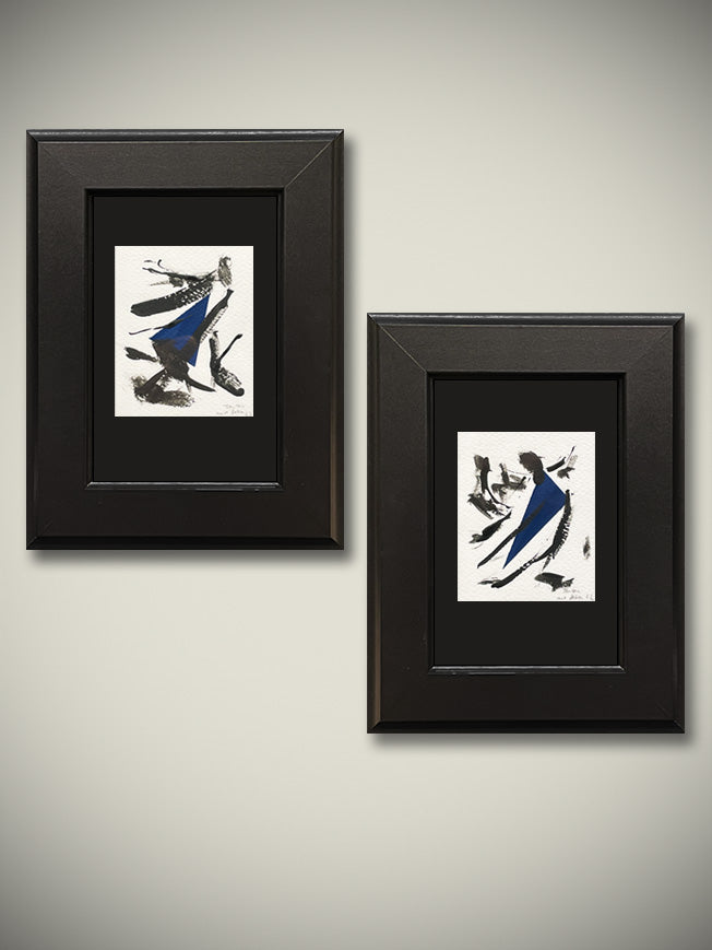 Un par de dibujos originales de estilo abstracto en acrílico sobre papel Canson blanco, en colores negro y azul. Montados sobre cartulina texturada negra y enmarcados con marcos recuperados tintados en color negro.